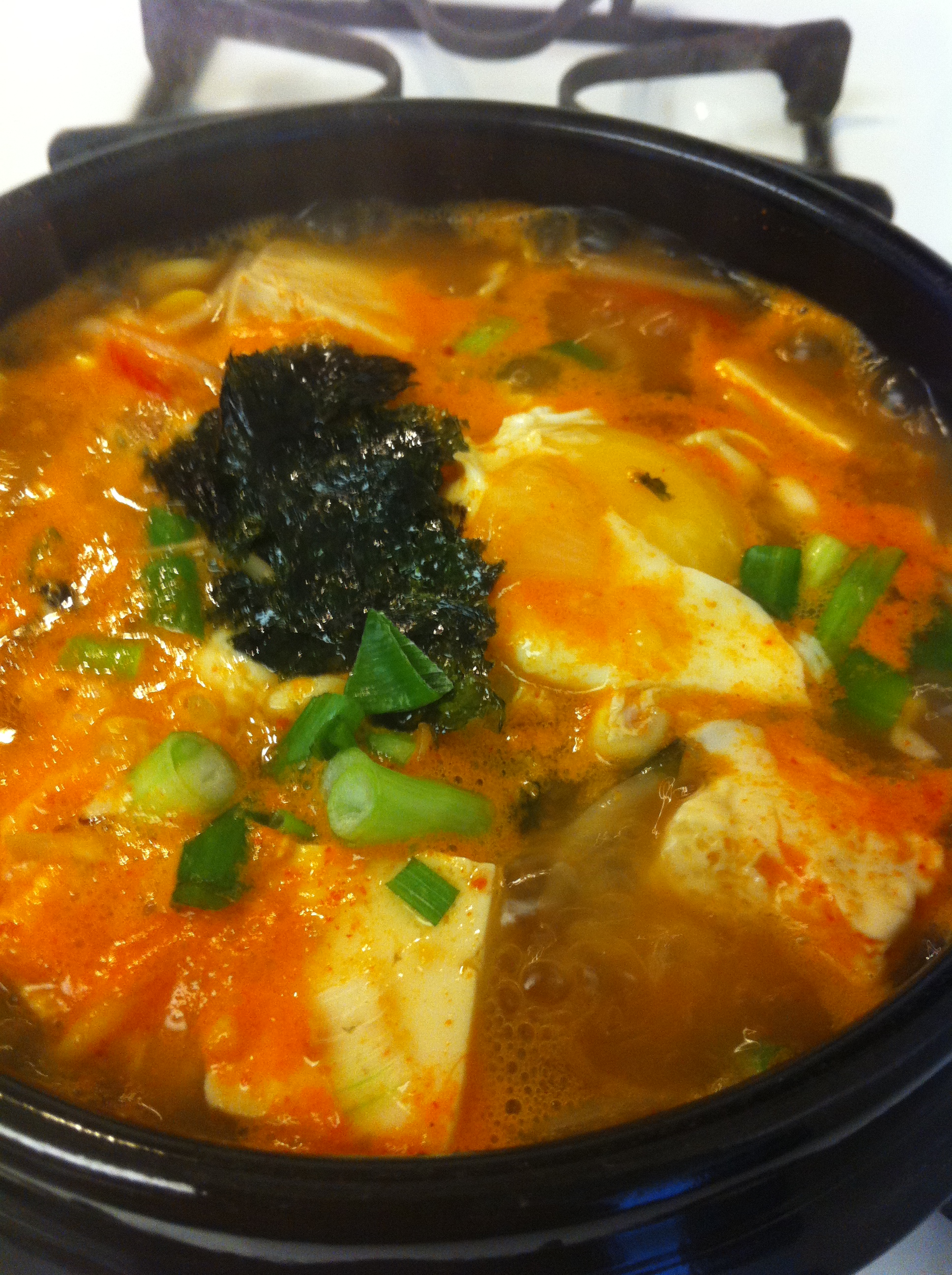 Kongnamul-gukbap (콩나물국밥) is a one pot meal made in a hot bowl with kongmamul-guk (콩나물국, soybean sprout soup) and rice on the bottom of the bowl. Instead of making this dish from scratch, I cheat by making this dish with leftover kongnamul-guk and rice. Although my method is unconventional, the kongnamul-guk is reborn into a sumptuous meal with only few ingredients within 10 minutes.