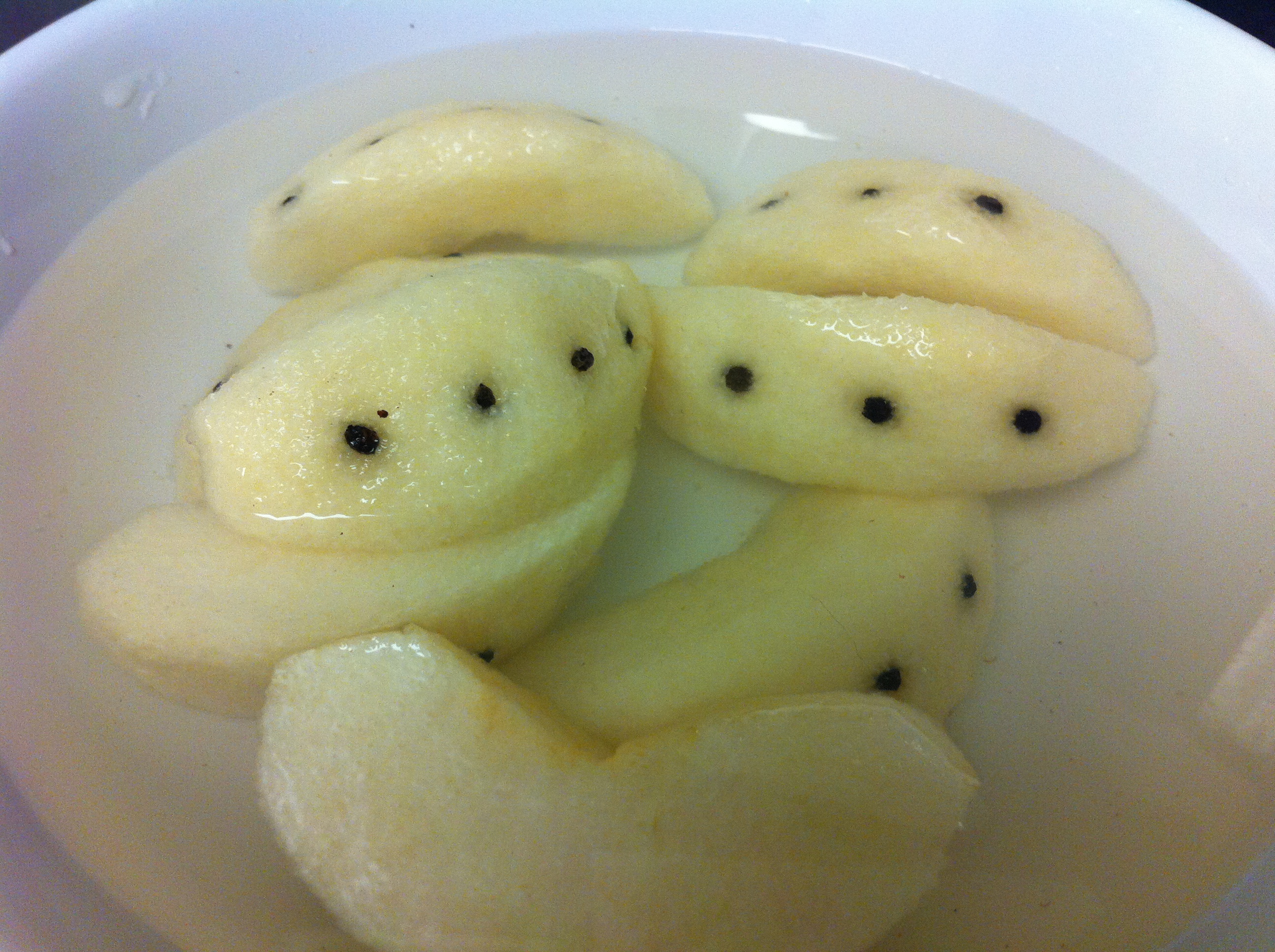 - While the ginger is brewing, mix the remaining water with 1 tablespoon of sugar. Cut the Asian pear into 8 slices and place it into the sugared water. This prevents the browning of the pear slices.