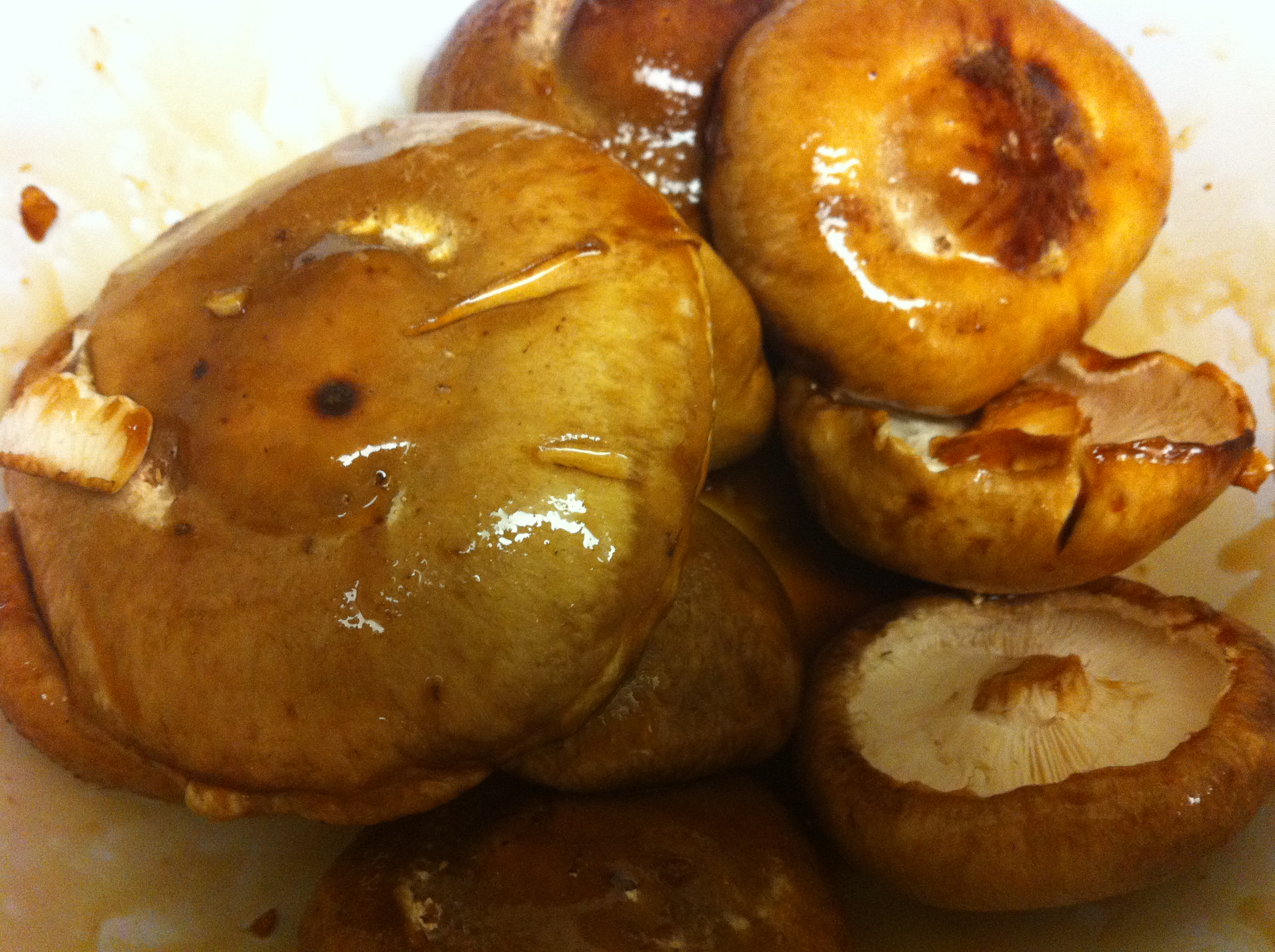 - If the shitake mushrooms are dried, soak them in warm water for about 20 minutes. Coat the mushrooms with a few tablespoons of marinade.
