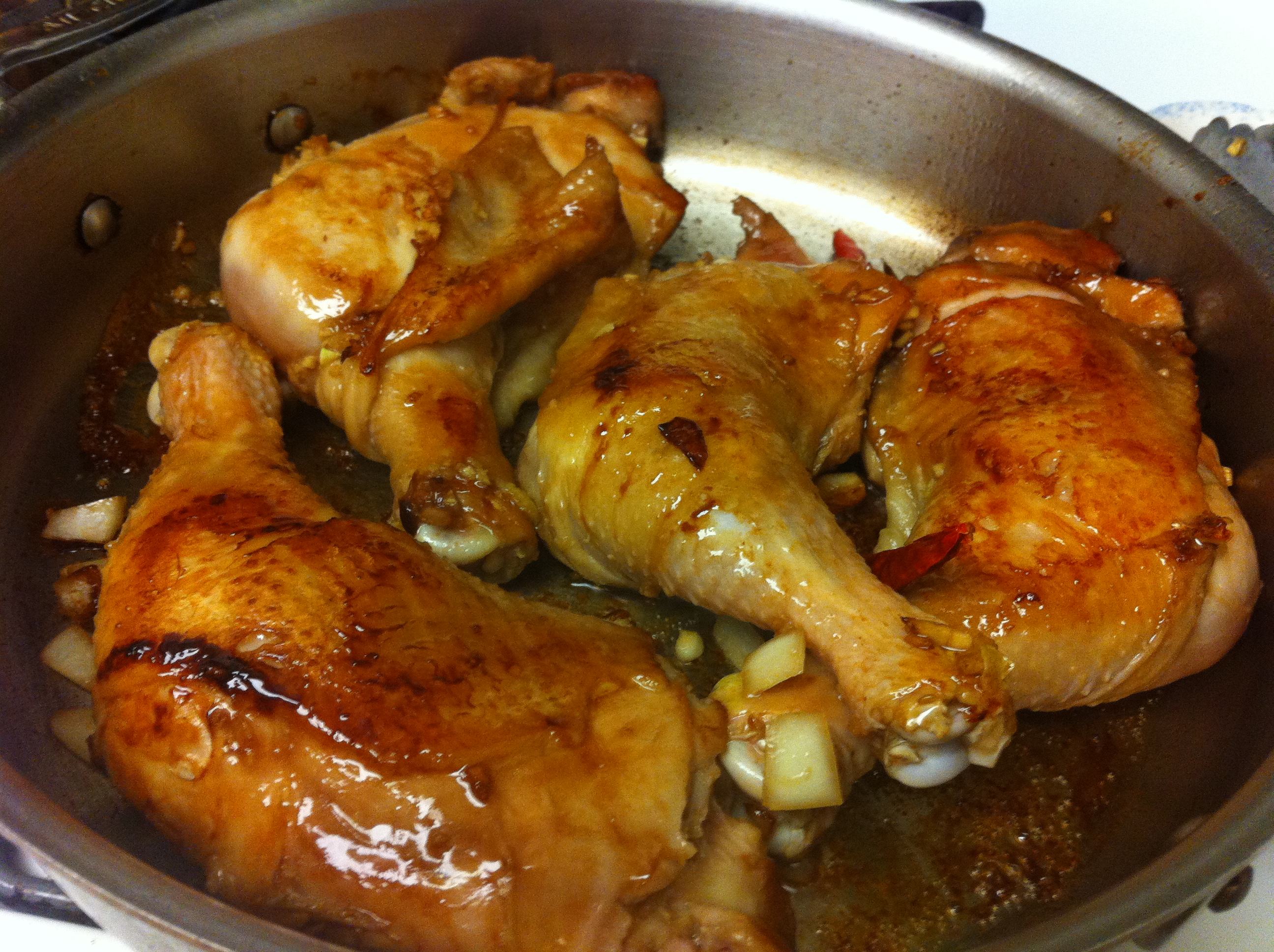 - On high heat, drizzle oil into a large skillet and brown the chicken skin side down. Do not pour the marinade the chicken was soaking in. When one side is browned, add the onions and flip the chicken to brown the other side. Make sure the onions do not burn.