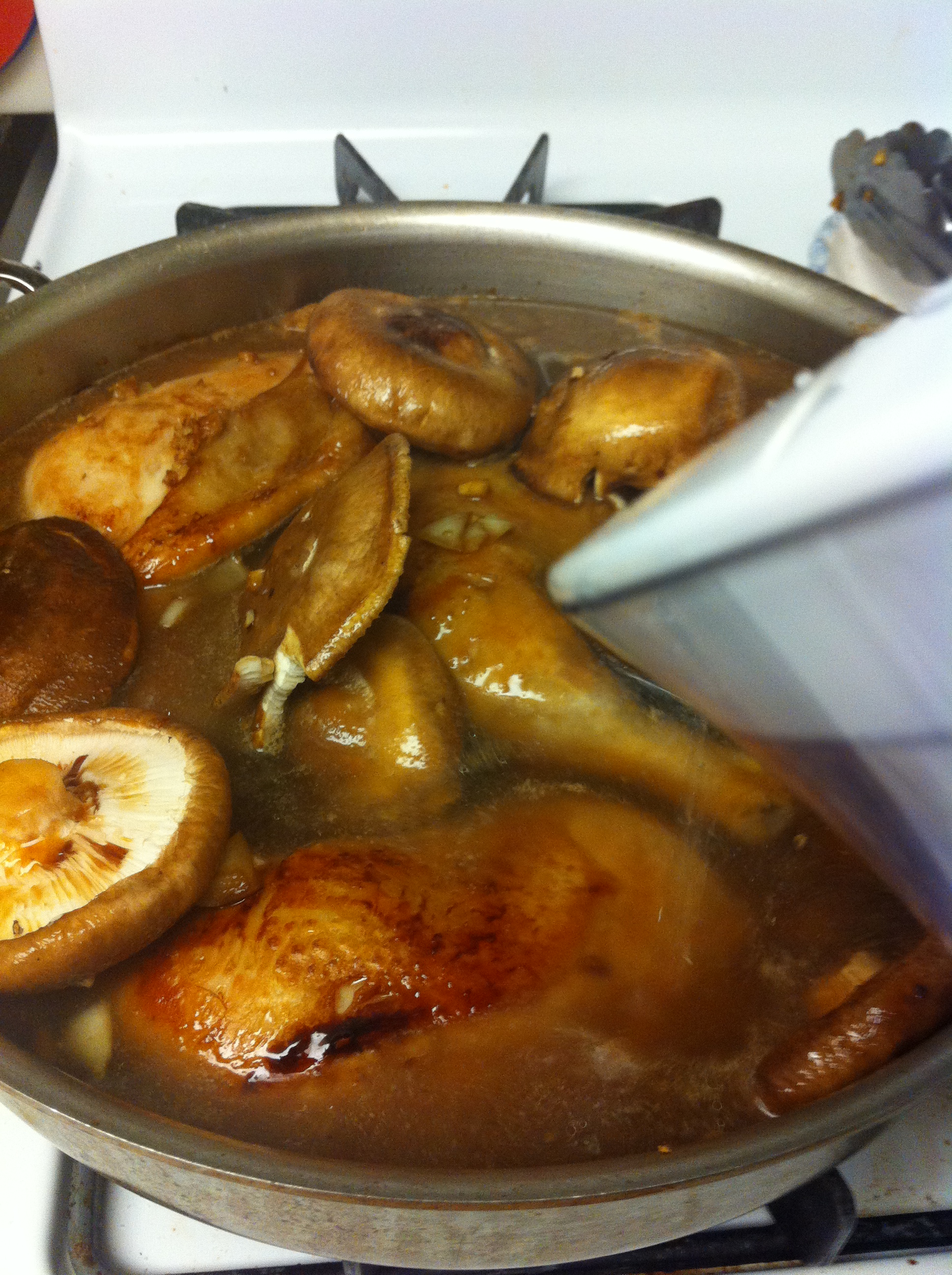 - When the chicken is browned on each side and the onions are sautéed, add the mushrooms and pour the marinade the chicken was soaked in with 1-2 cups of water and cover.