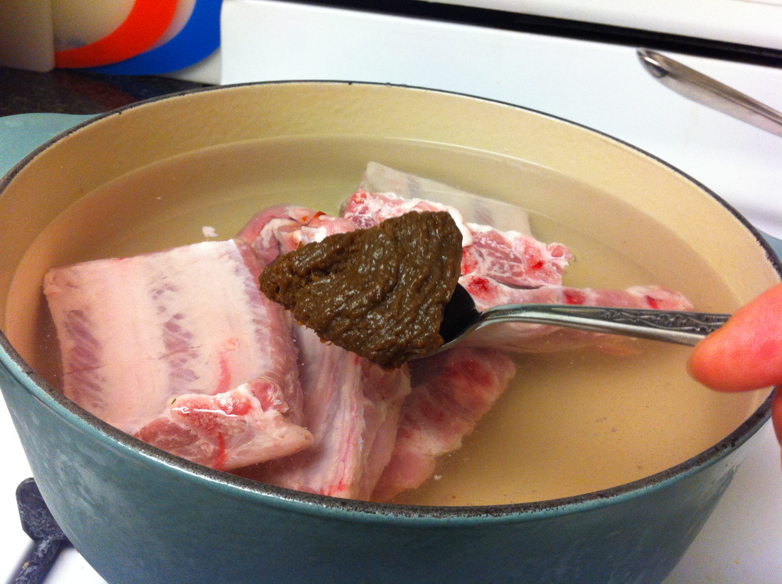 - Drain the water and place the ribs in a large pot and pour enough about 6 cups of cold water that it is at least 2 inches over the ribs. Mix in a tablespoon of duenjang, pieces of ginger and sake. Duenjang, ginger and sake helps with the porky smell. It is also said that duenjang helps lower the cholesterol that can be consumed with the pork.