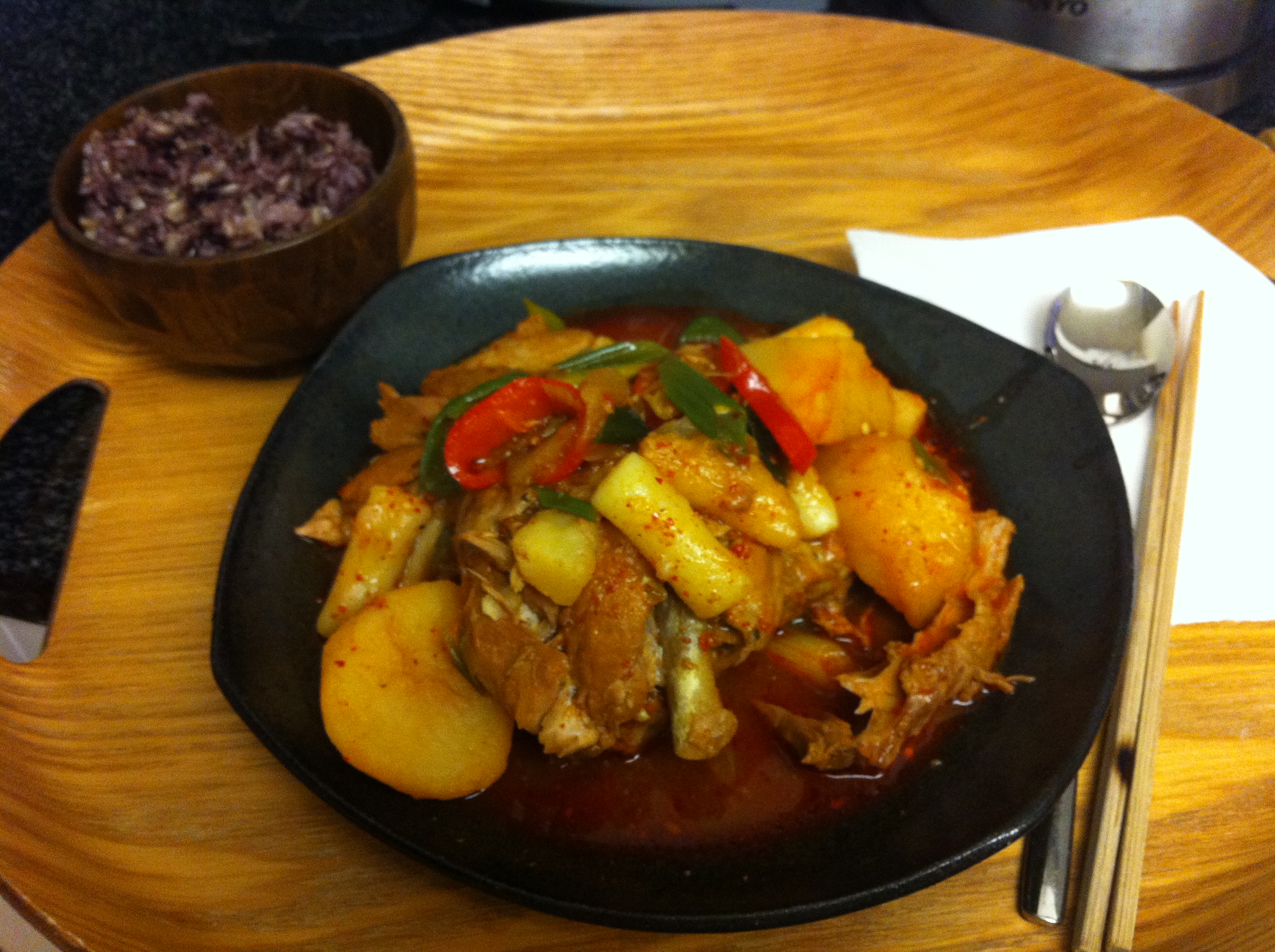 My husband and I went to a Korean butcher in Flushing last weekend. When he discovered pork ribs in the store, he asked “What do Koreans make with these?” I have made kimchee-jjim before with pork ribs, which I will post at a later time, but today I decided to make spicy dueji-galbi-jjim (매운돼지갈비찜). As you can tell by its name, spicy dueji-galbi-jjim is a spicy stew made with pork ribs. You can add any variety of vegetables such as potatoes, carrots and mushrooms. I used only one potato today since that was all I had. The greatest part was that I had leftover “Spicy Korean BBQ Marinade” from making dubu-kimchee about a week ago and simply used that instead of making a sauce from scratch. As I mentioned earlier, you can use this marinade for osam-bulgogi and dubu-kimchee amongst others.