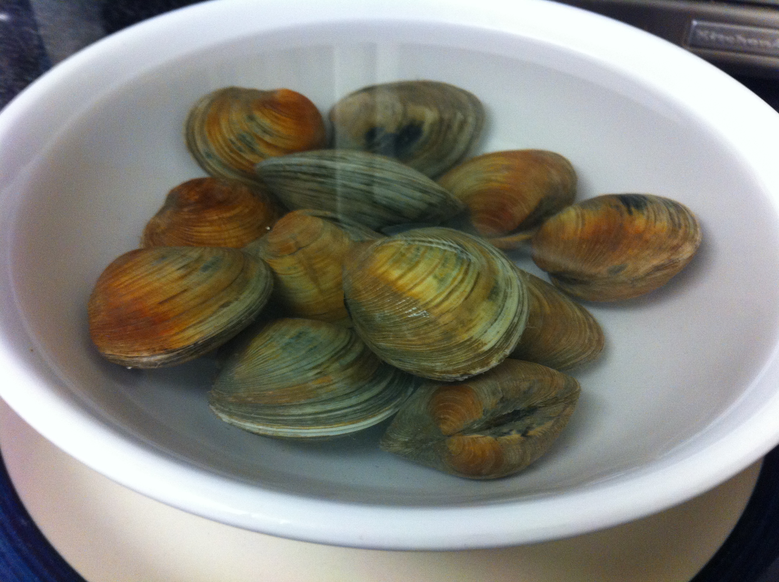 - Soak the cleaned clams in cold water with a little salt. Cover the bowl with foil and place them in the refrigerator for at least an hour. This dark salty water emulates the sea and the clams will spit out sand they have. This process is called haegam (해감) in Korean.