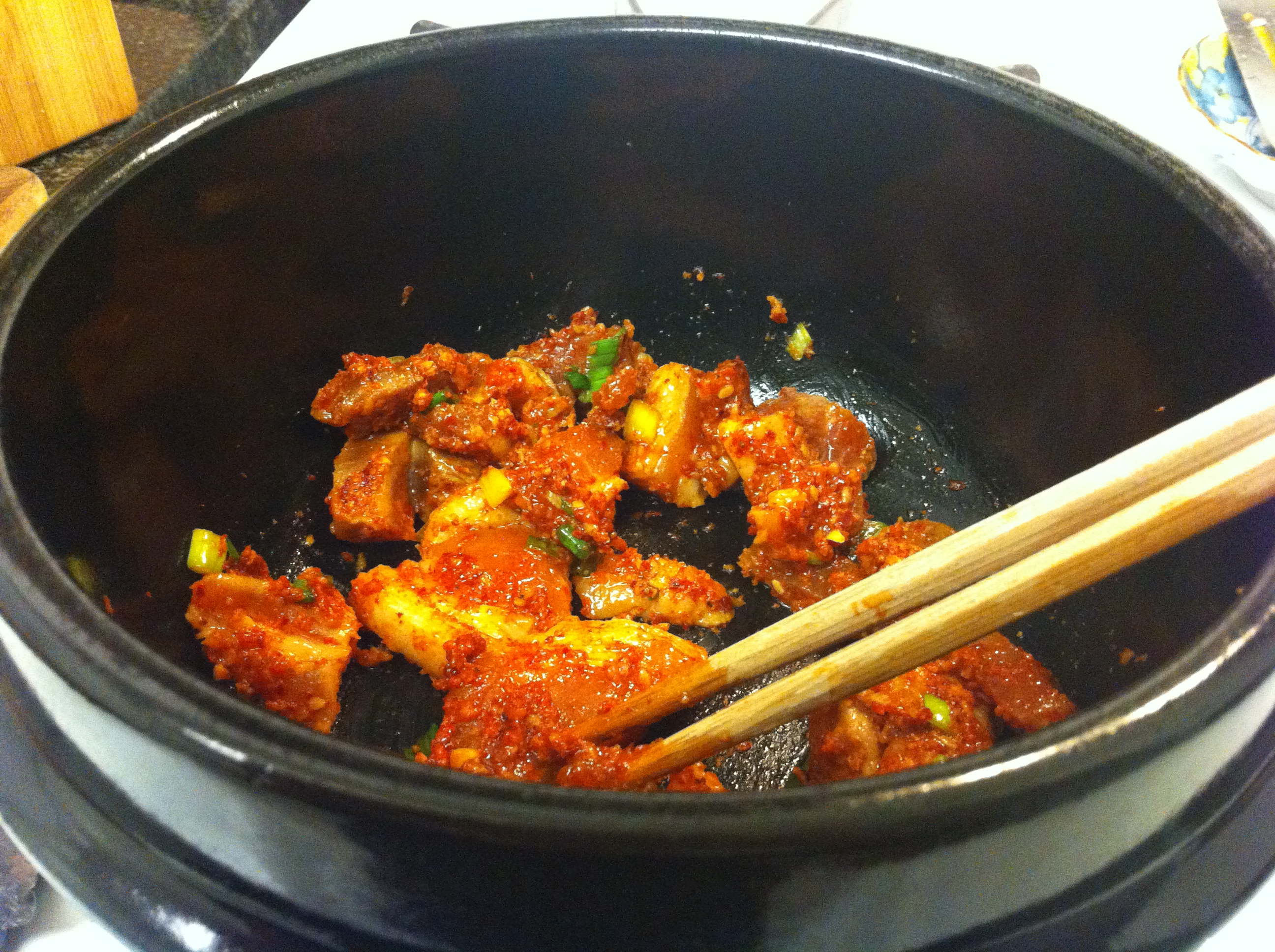 - In a pot or ttuckbaegi (뚝배기), which is Korean earthenware pot, sauté the marinated pork for about 3 minutes on medium heat. If the heat is too high, the pork will start sticking on the pot.