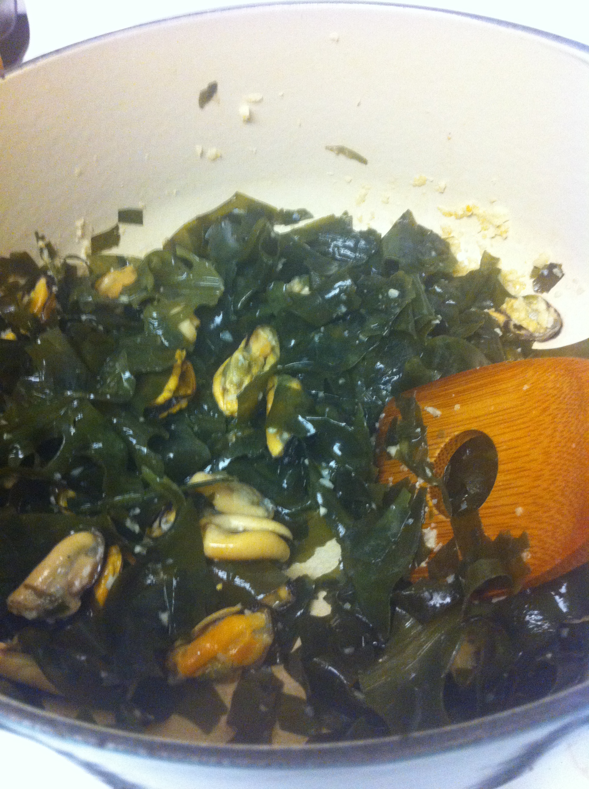3. In a pot, drizzle the perilla or sesame oil and sauté the garlic, miyuk and mussels for about 4-5 minutes until the seaweed is coated with the oil and most of the moisture is gone.IMG_2153