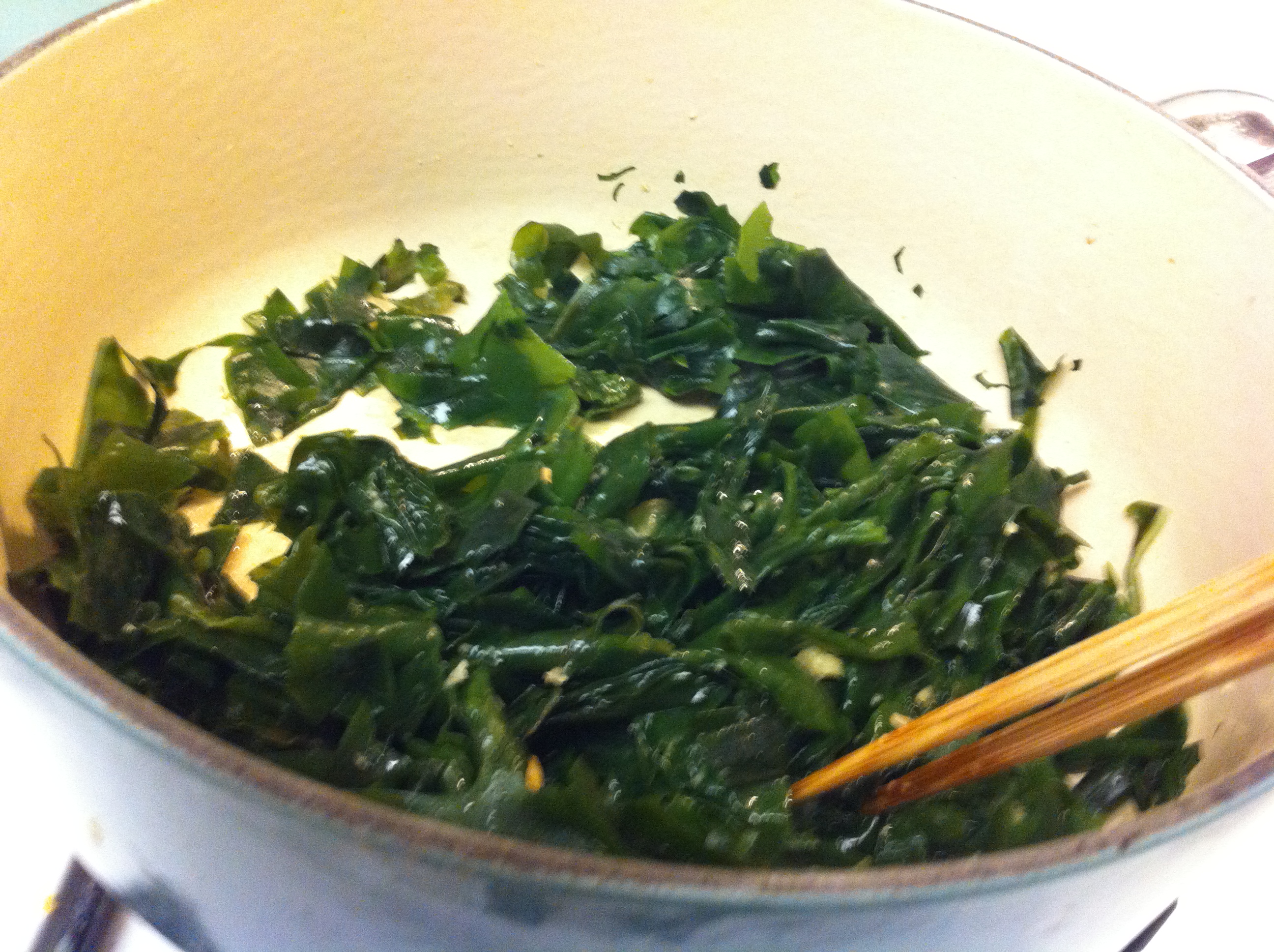 6. In a pot, drizzle the perilla or sesame oil and sauté the garlic, miyuk for about 4-5 minutes until the seaweed is coated with the oil and most of the moisture is gone.IMG_3094