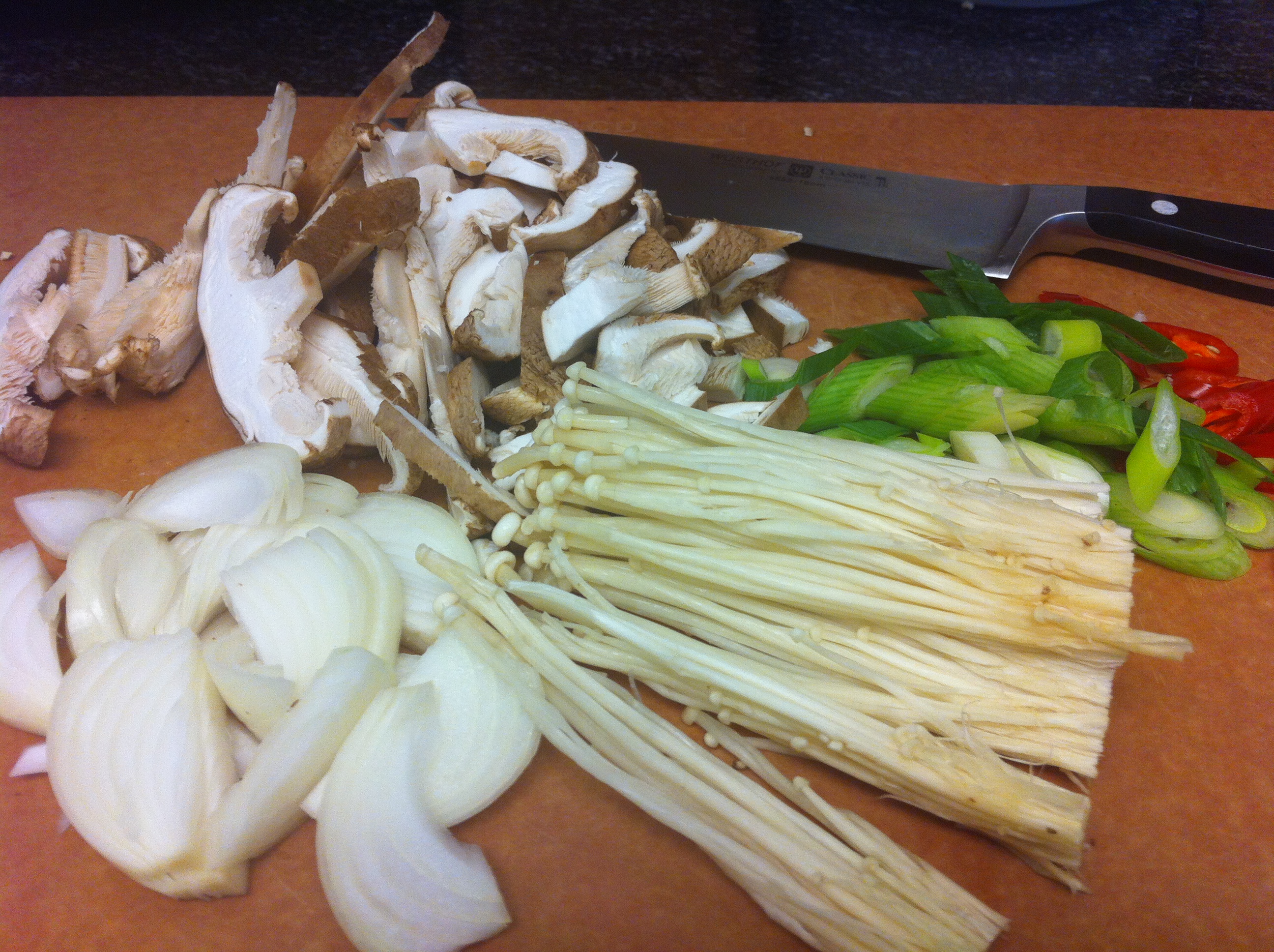 • About 1 cup of mushrooms, thinly sliced (I used enoki and shitake mushrooms)