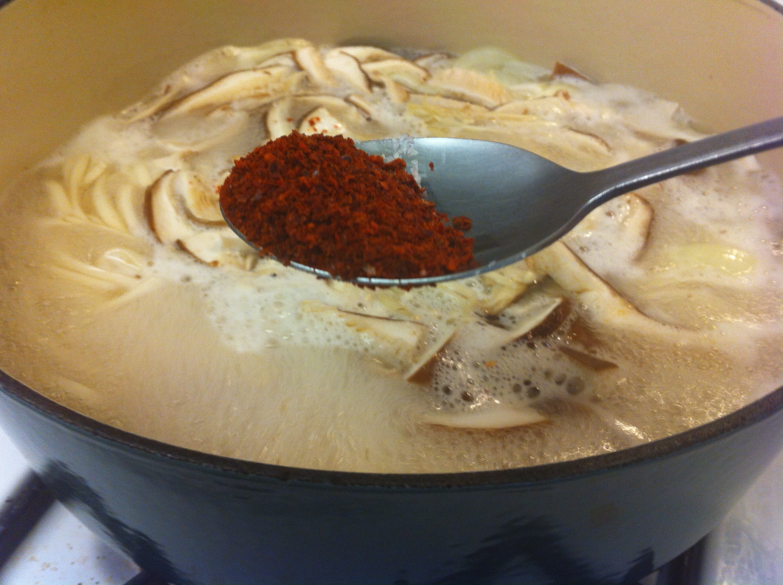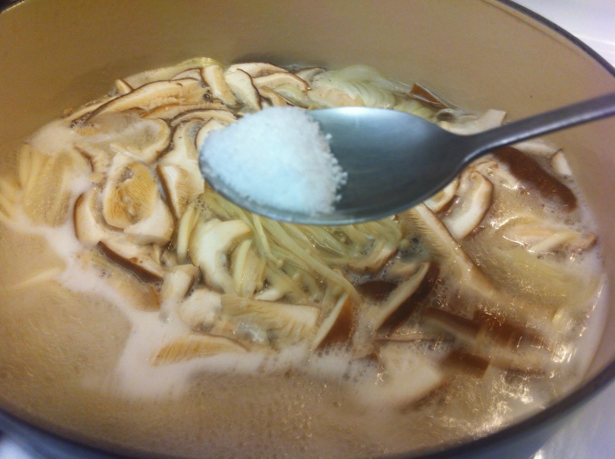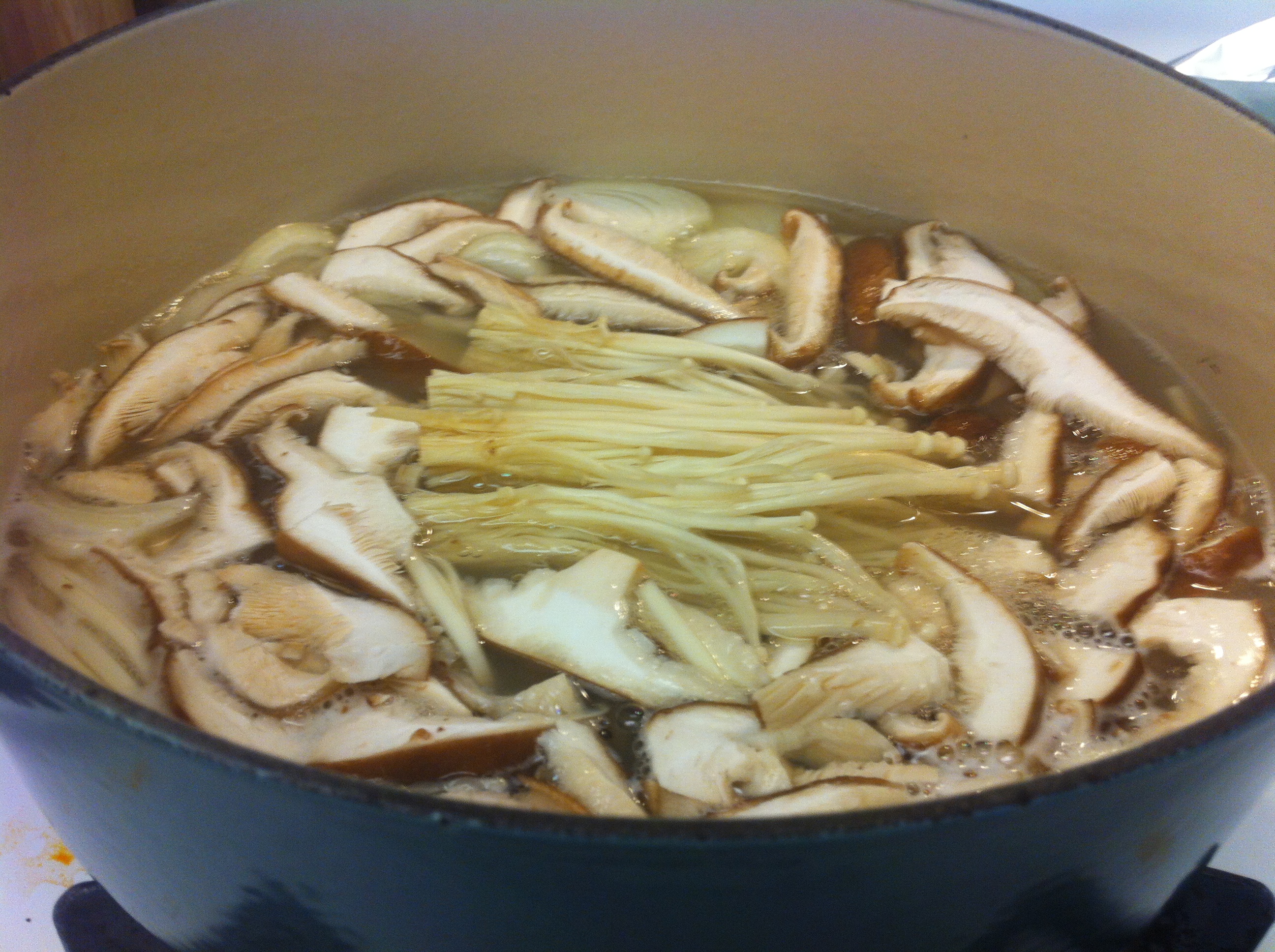 3. Add the kalguksoo or Korean wheat noodles, onion, garlic and mushrooms.IMG_3004IMG_3490 IMG_3492