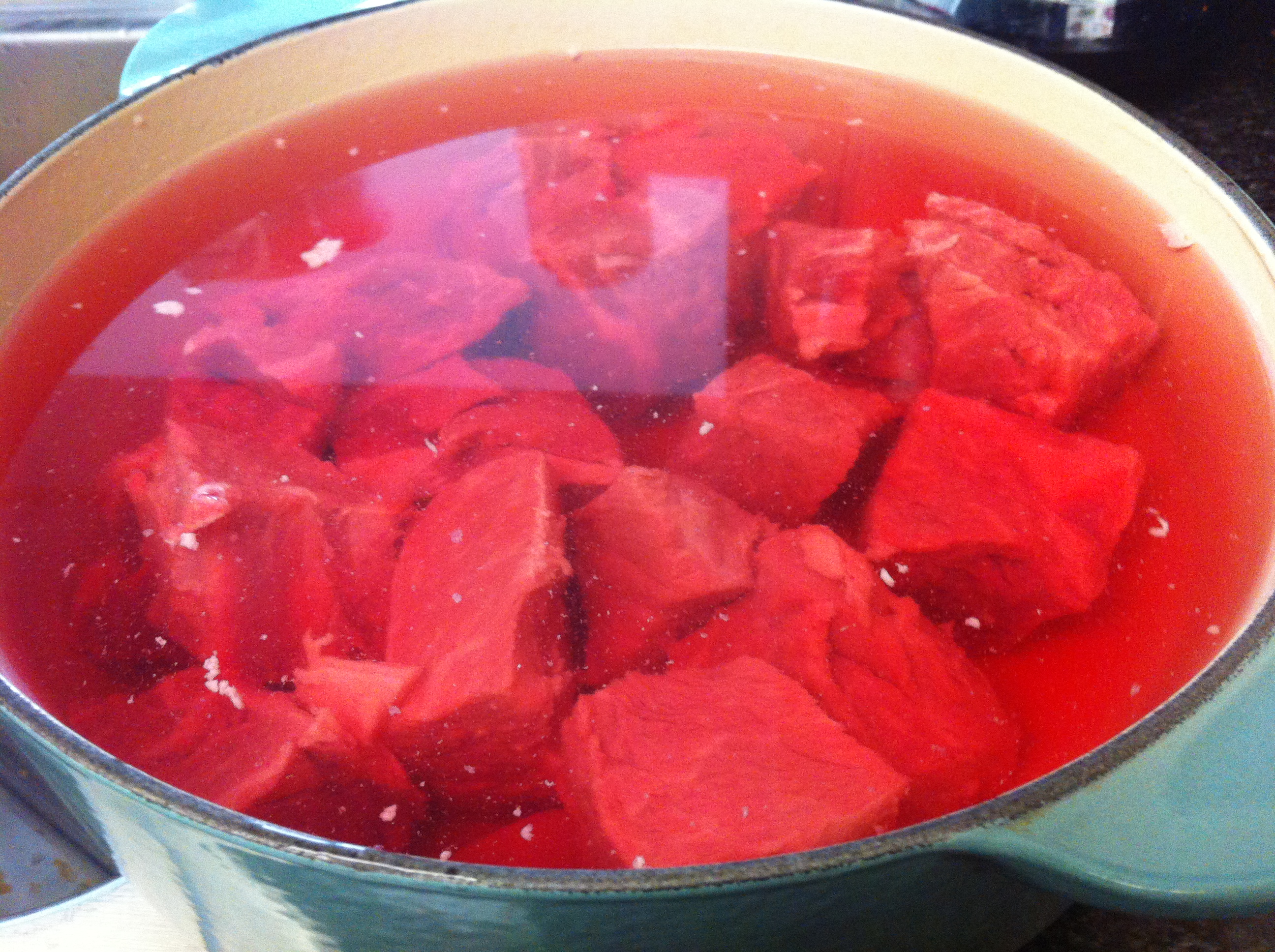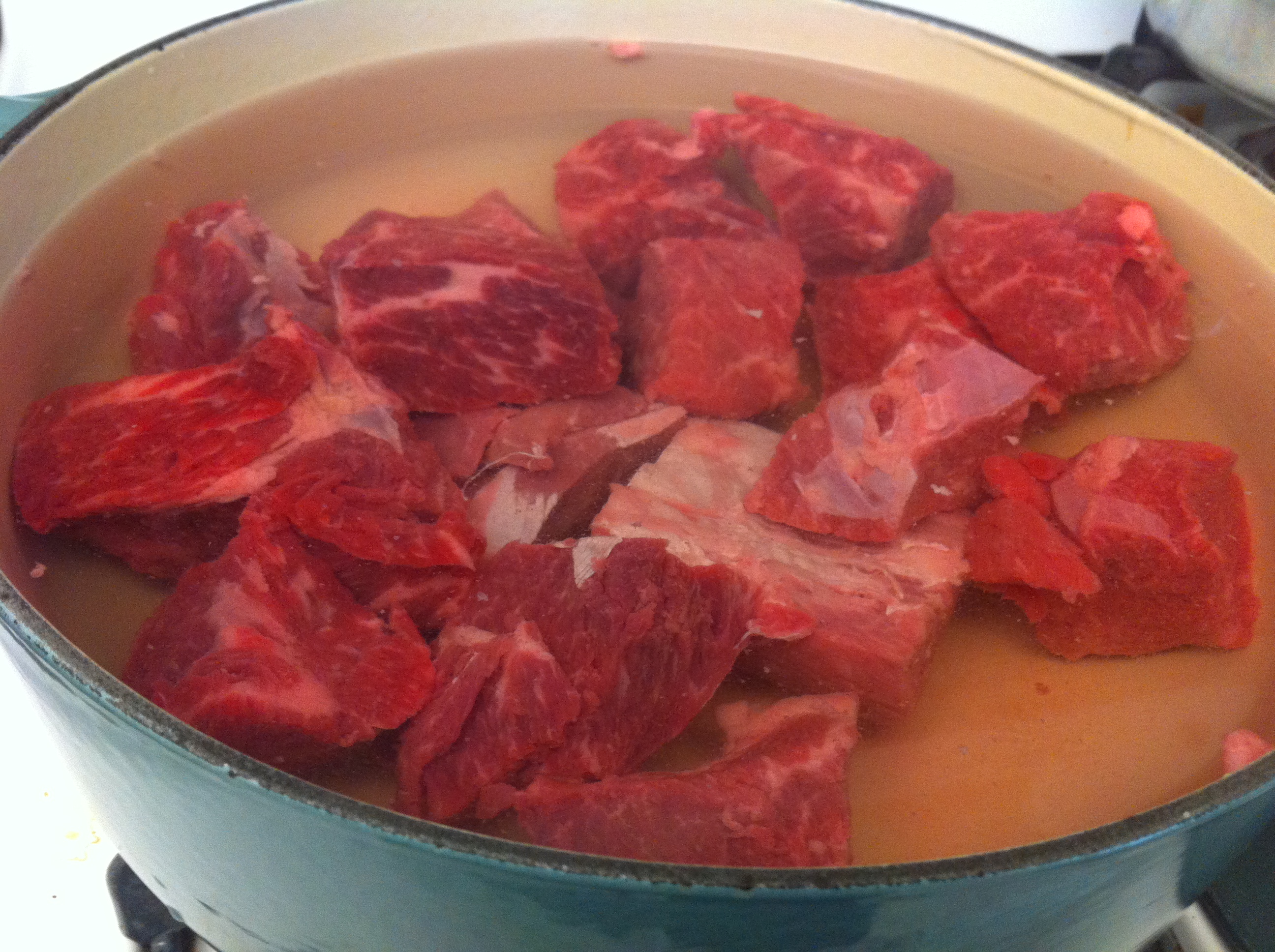 3. Throw away the water the meat was soaking in. If you like, you can boil the short ribs in a large pot of fresh water. Throw the water away after about 5 minutes of boiling and rinse. This gets rid of excess fat and the meaty odor. I skipped this step.IMG_3556