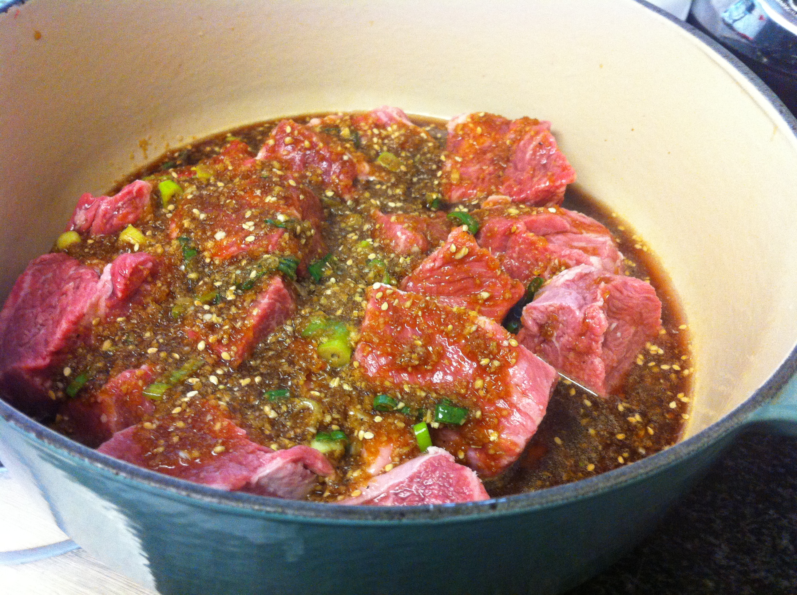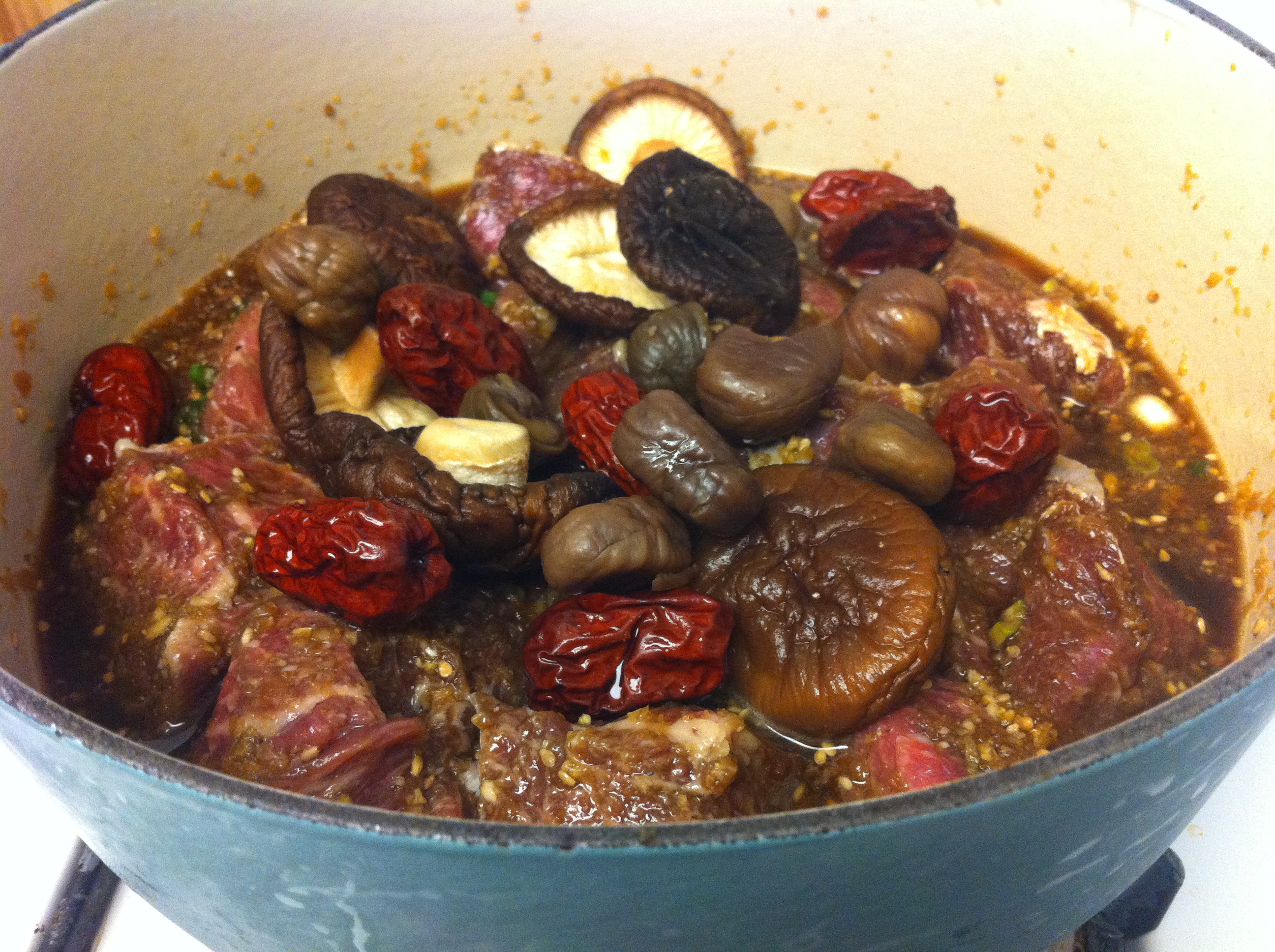 7. Place the marinated short ribs and the rest of the ingredients except for the pine nuts and the remaining sesame seeds in a heavy pot and pour about 1 1/2 cup of water.IMG_3565