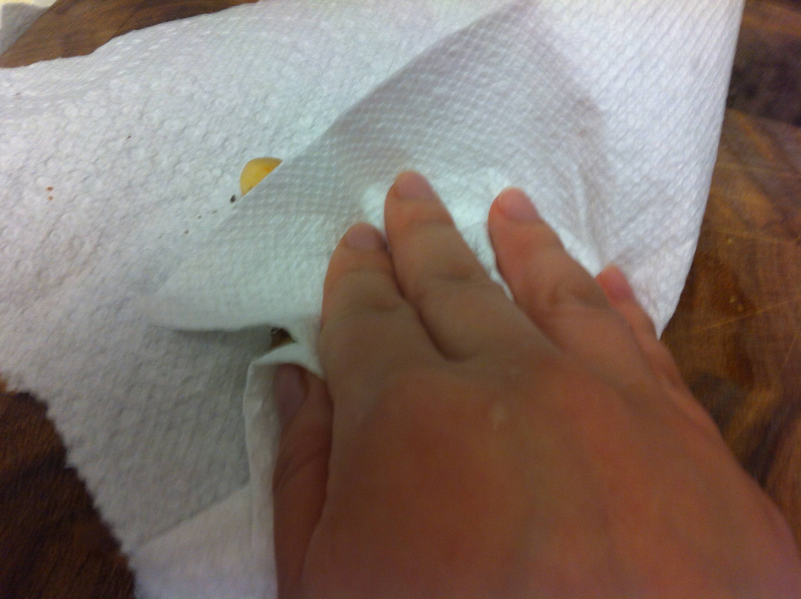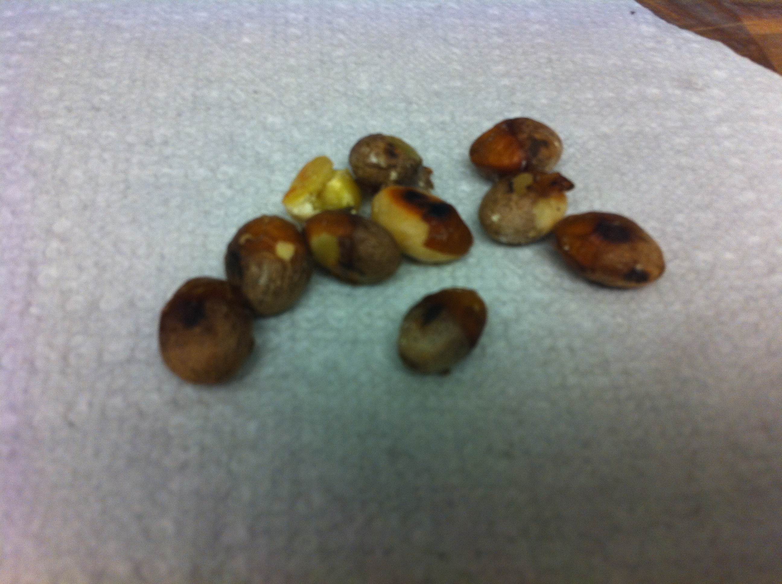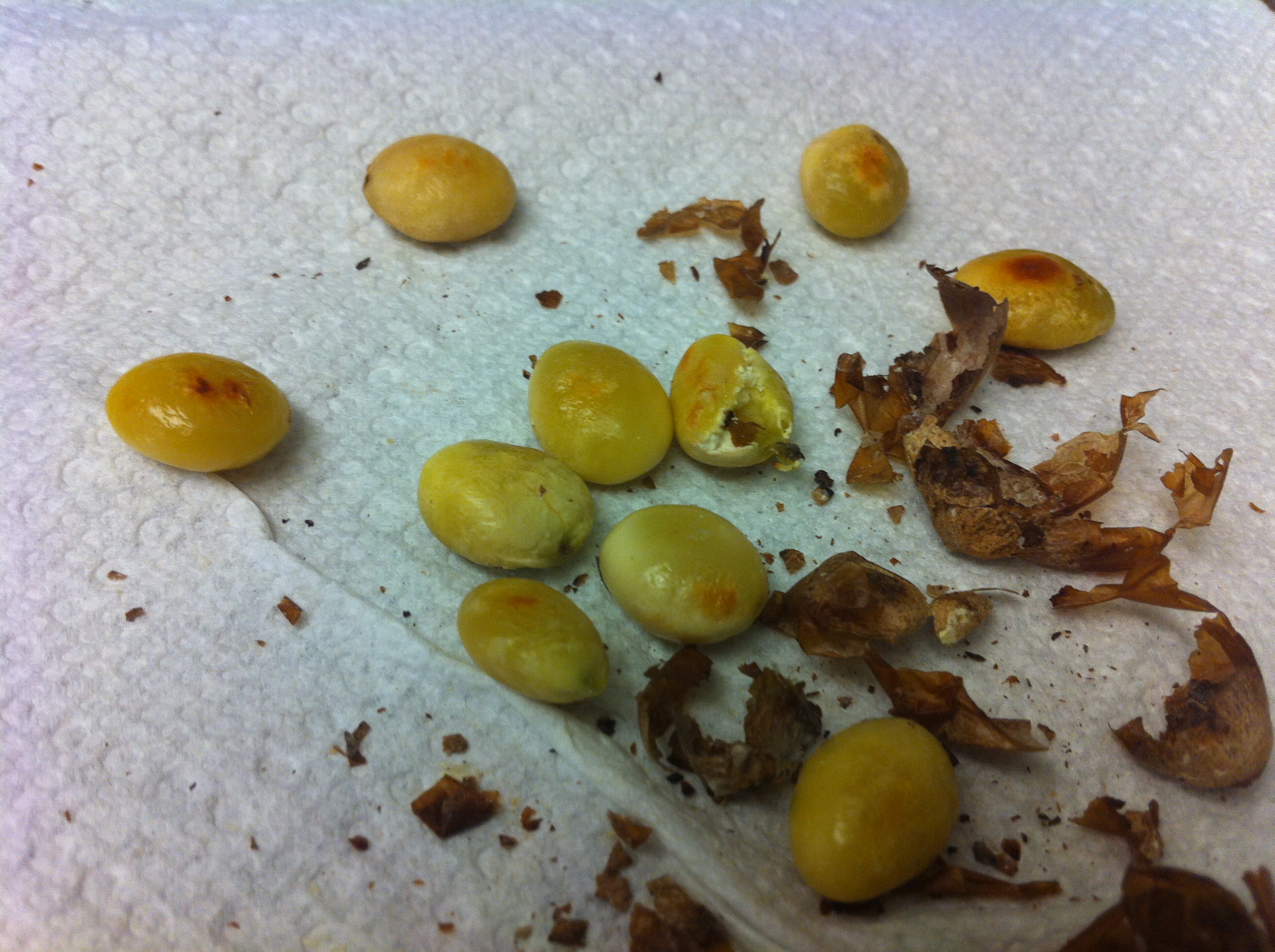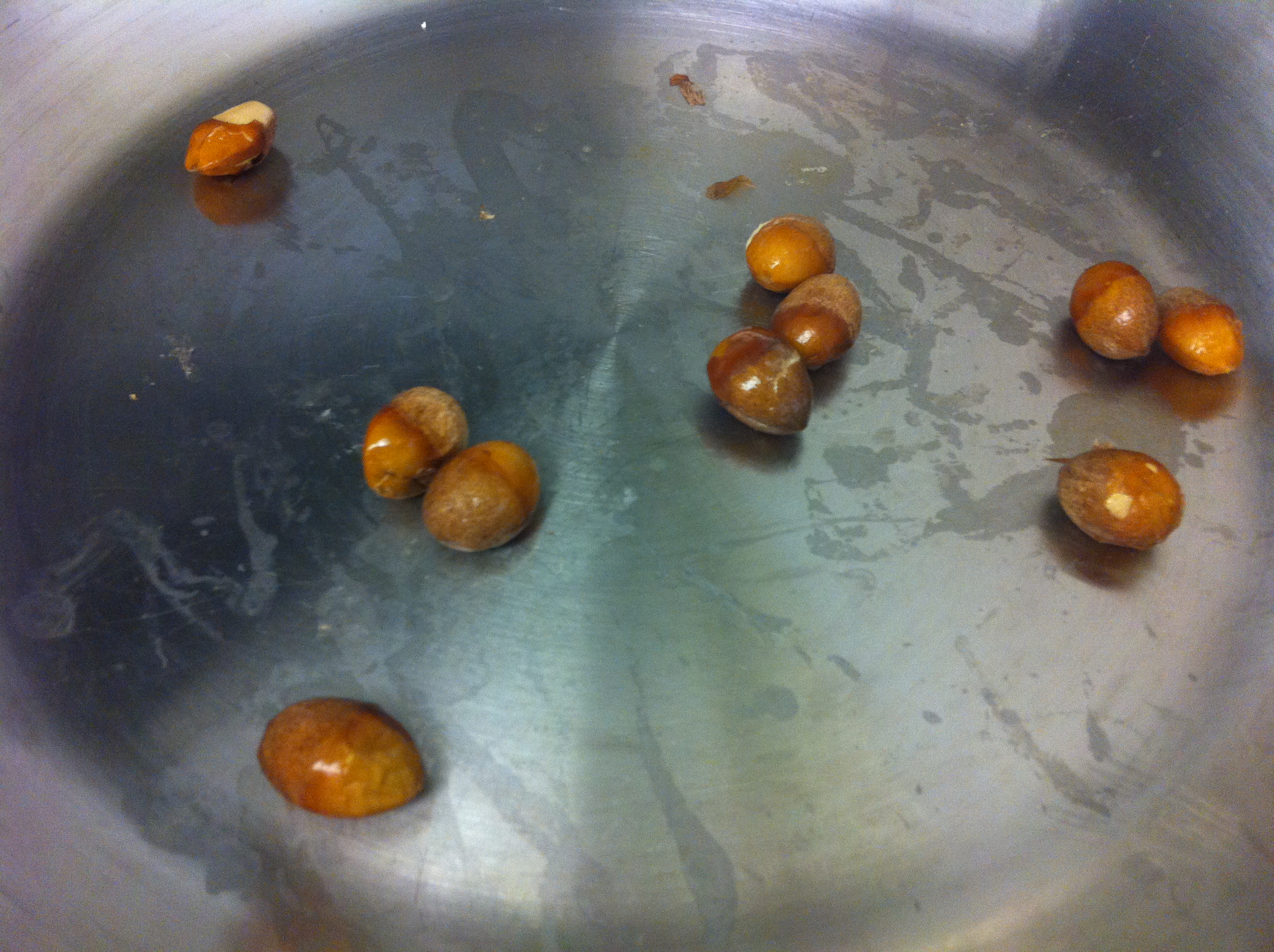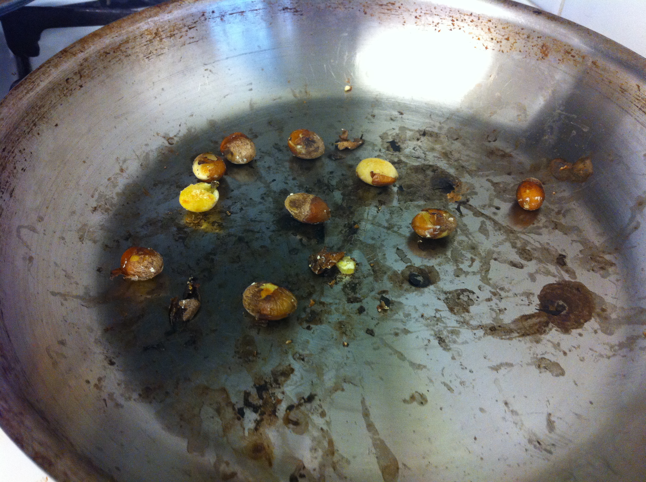 5. If you are using eunhaeng (은행) or ginkgoes, heat a skillet on medium heat. Add the ginkgoes without any oil and stir for about 3-5 minutes until the skin of the ginkgoes start cracking. Let it cook and place them between paper towels and rub them. The skin should come right off.IMG_3562IMG_3567 IMG_3568 IMG_3569 IMG_3570