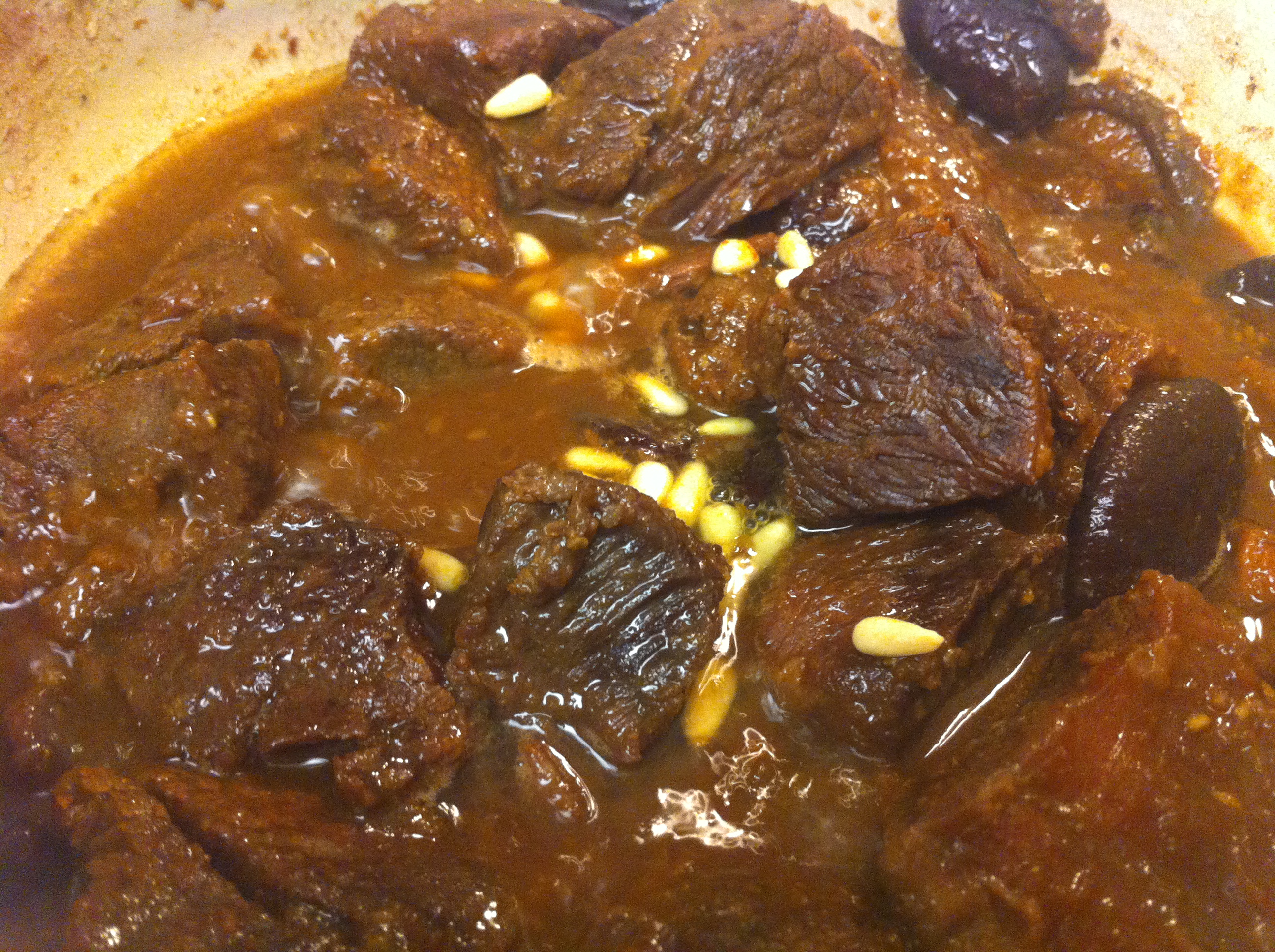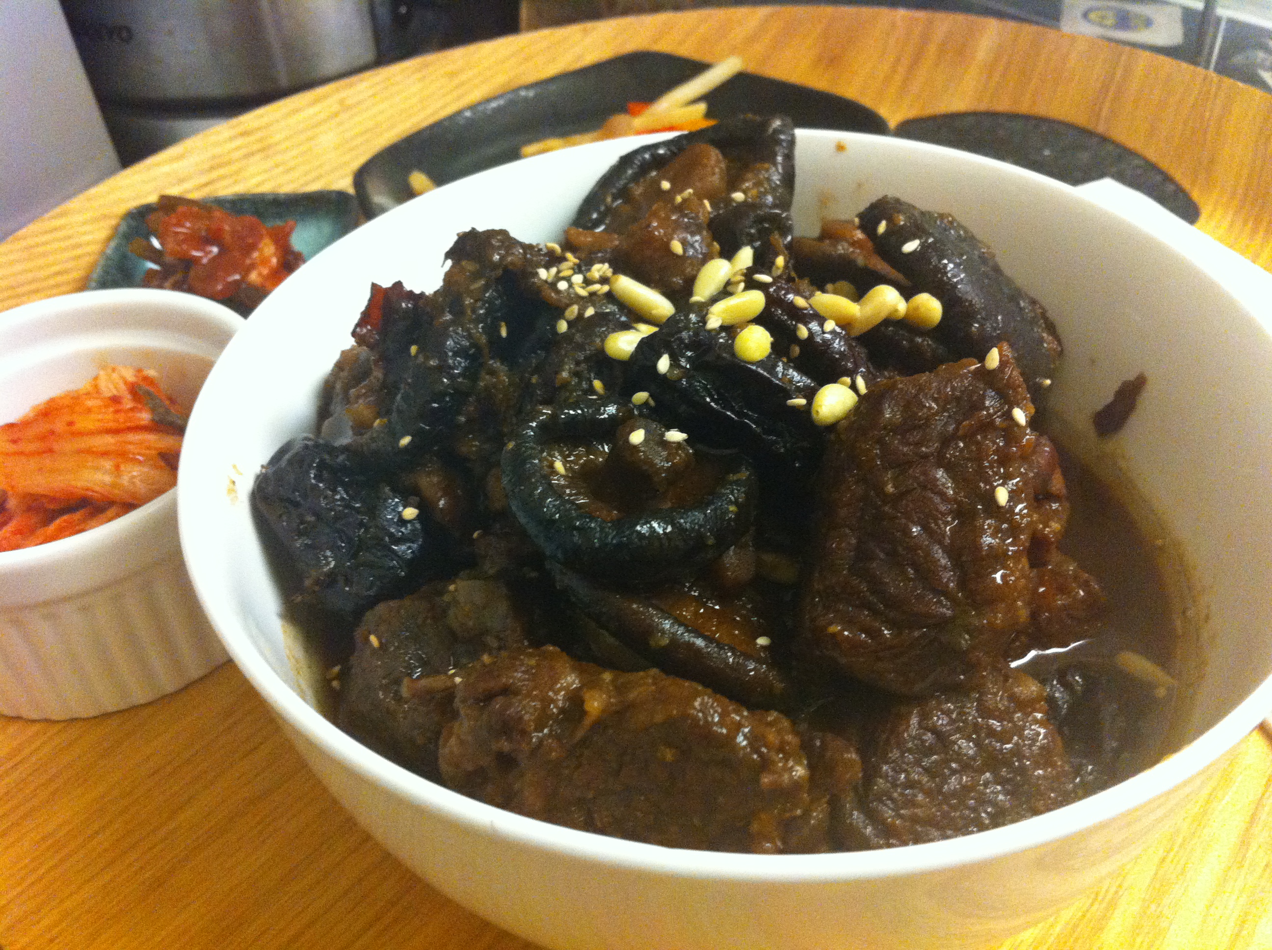 10. Finally open the lid, bring the heat back up to high and reduce the sauce for about 10 minutes. This helps the galbi-jjim to have a sheen. Taste and add more marinade if needed. Garnish with pine nuts and the remaining sesame seeds.IMG_3603