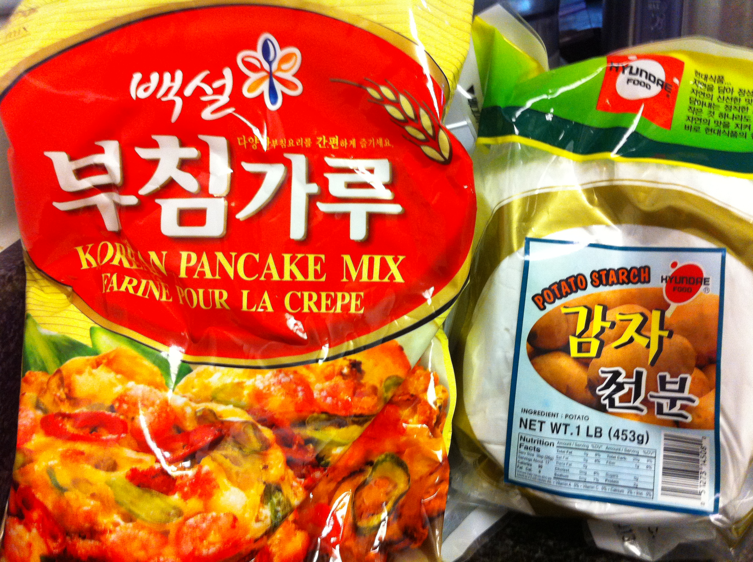 - Mix the Korean pancake mix (buchim-garu, 부침가루) with 2 tablespoons of potato or corn starch.