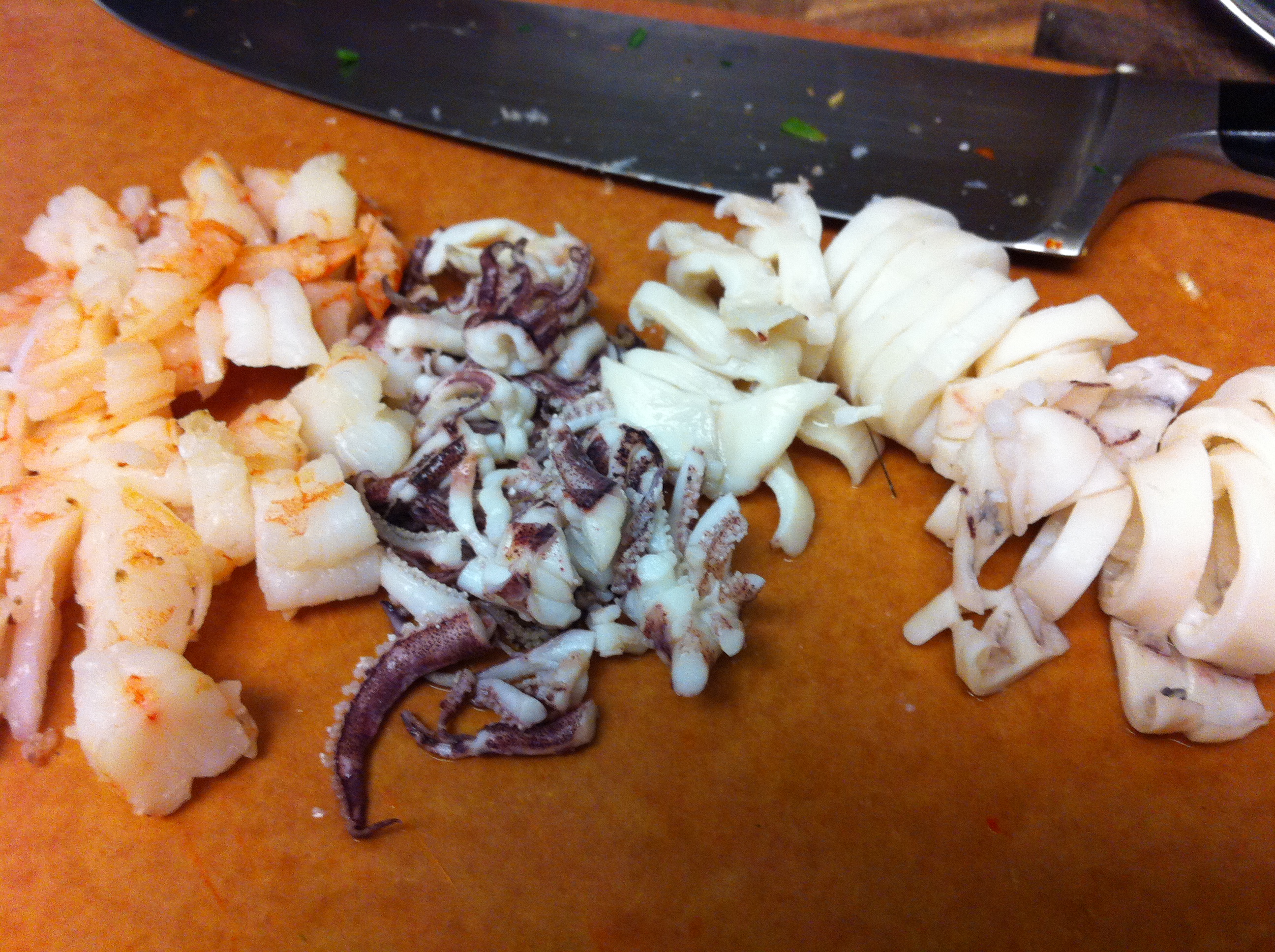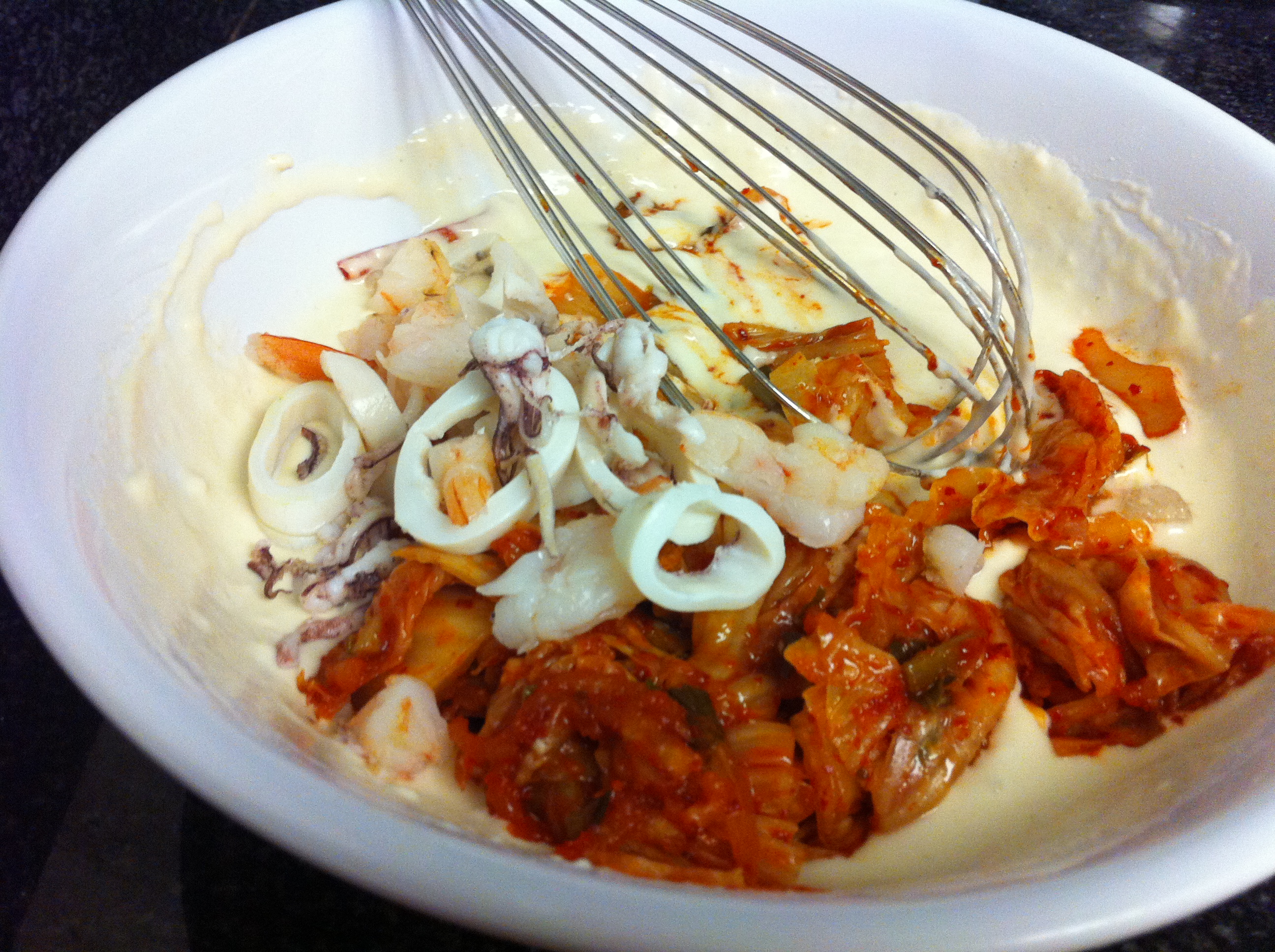 - Split the seafood into half so you can use 1/2 in the kimchi-jeon and the other in the buchu-jeon.