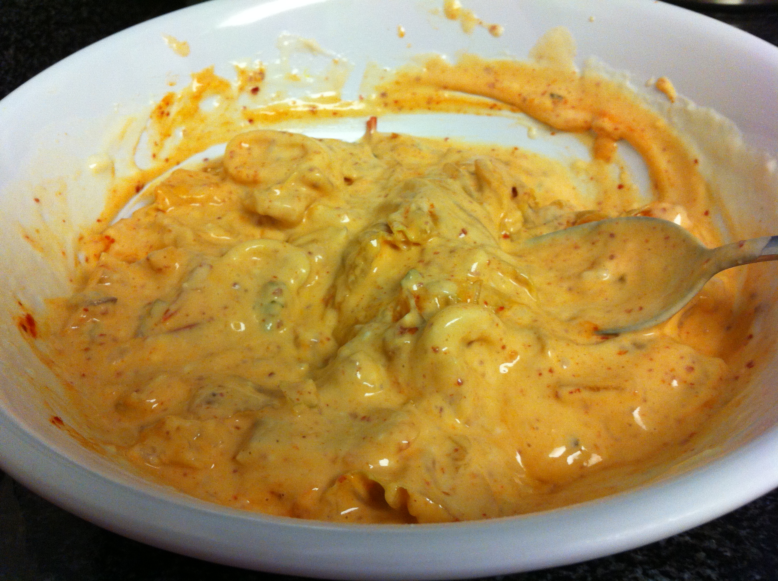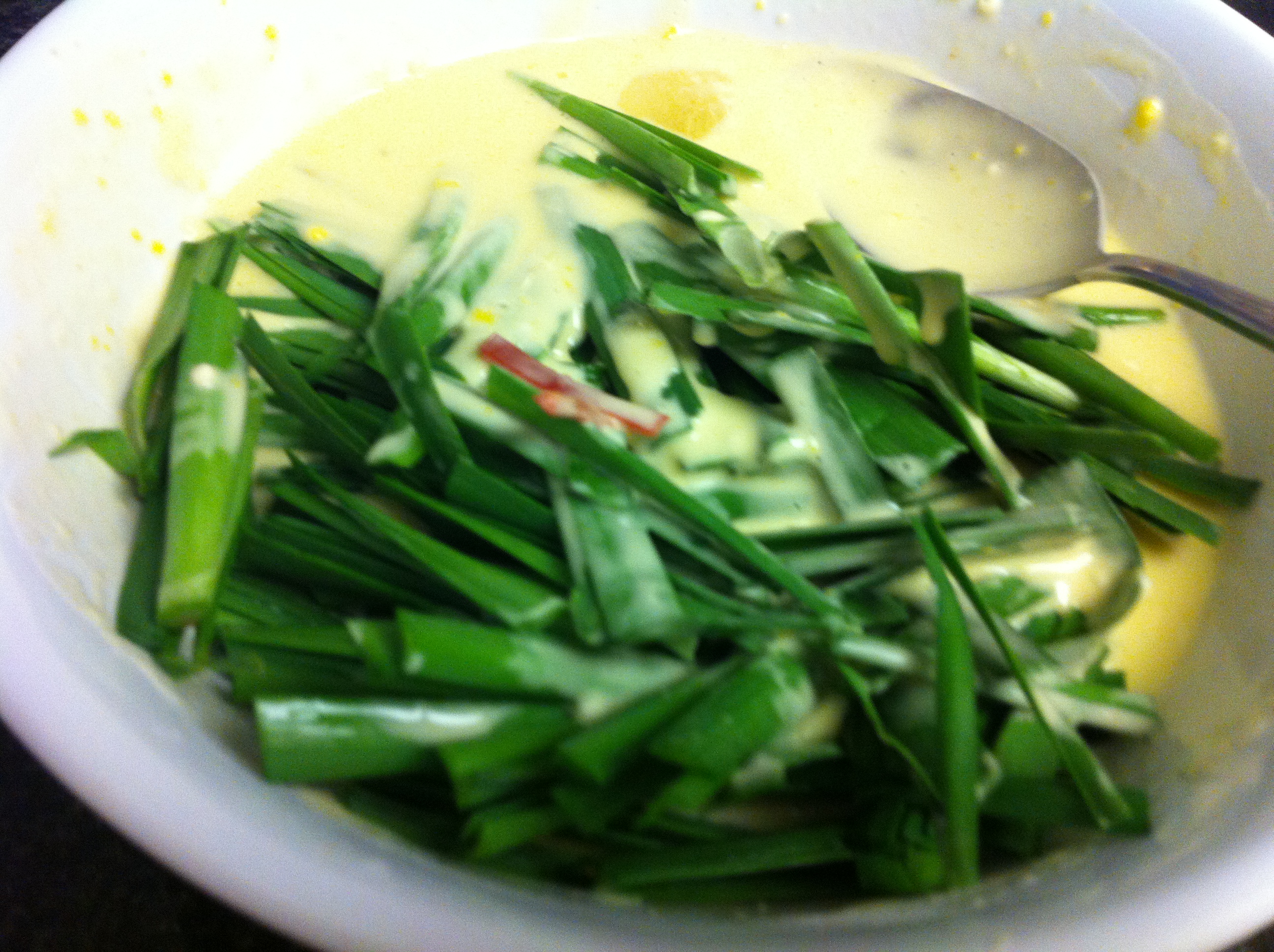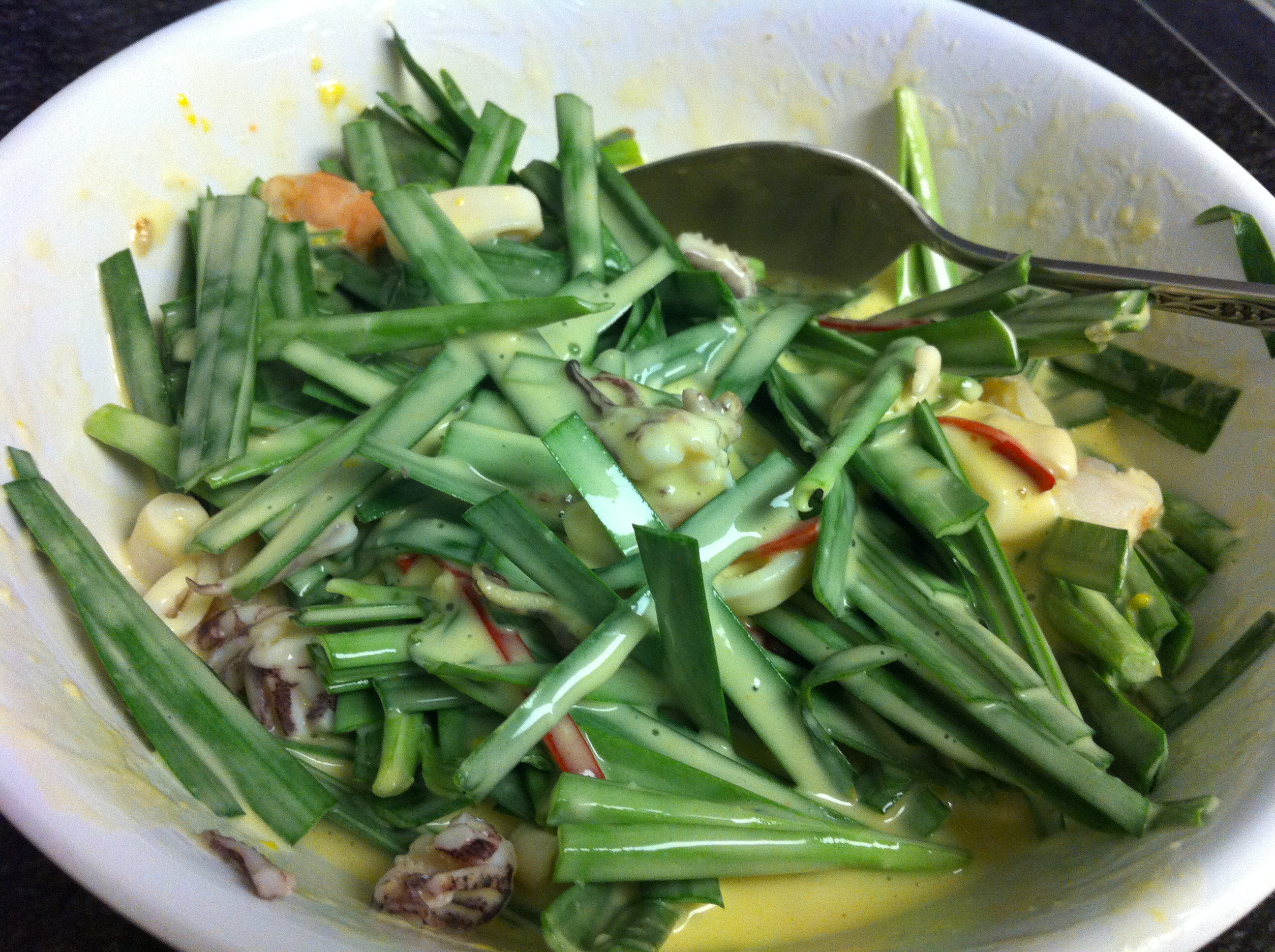 - Mix in the seafood, red chili and boochu. Gently stir the mixture with a spoon so the chives do not get bruised. You will notice that the batter in just enough to coat the chives and seafood, which is perfect.