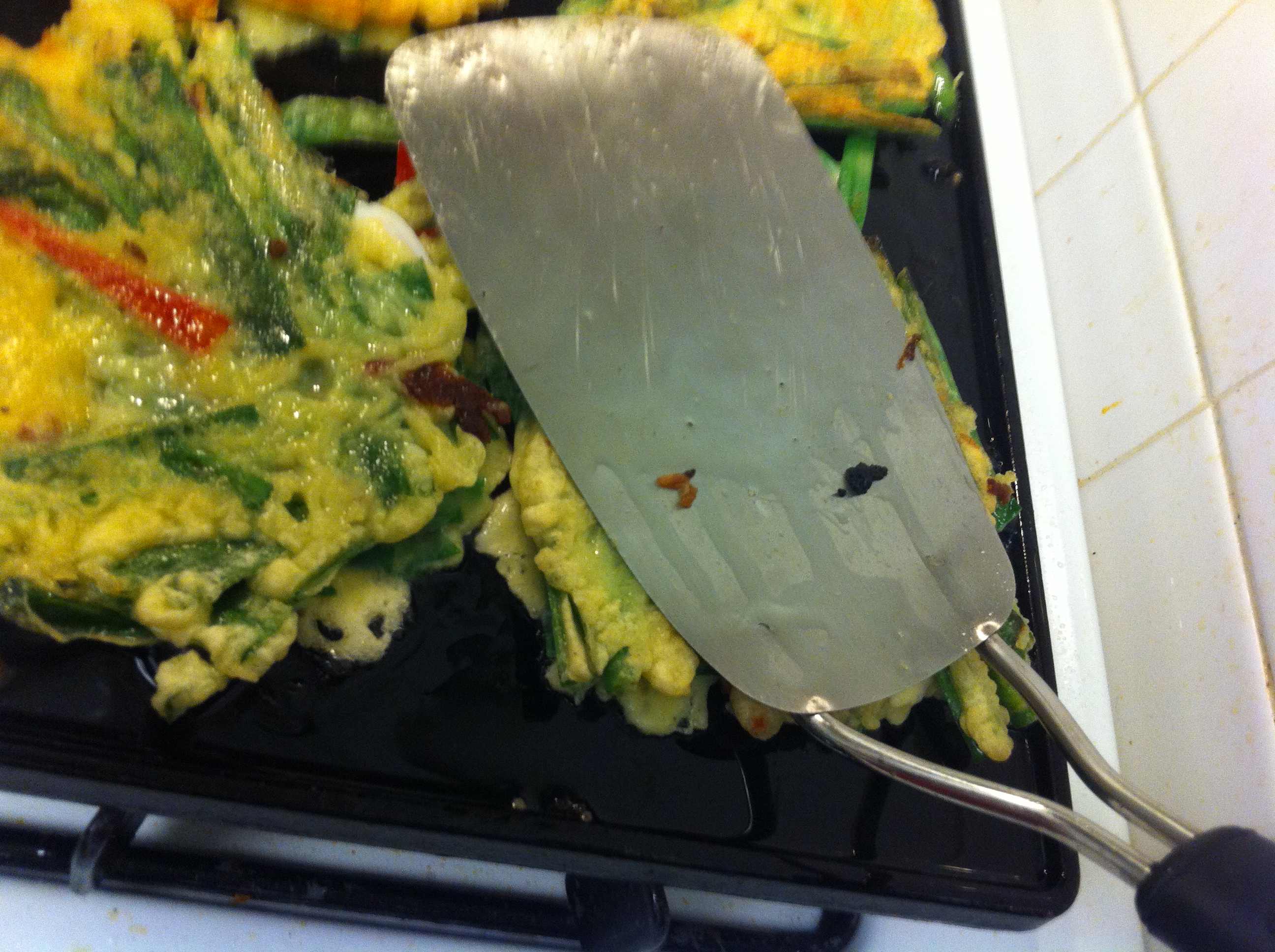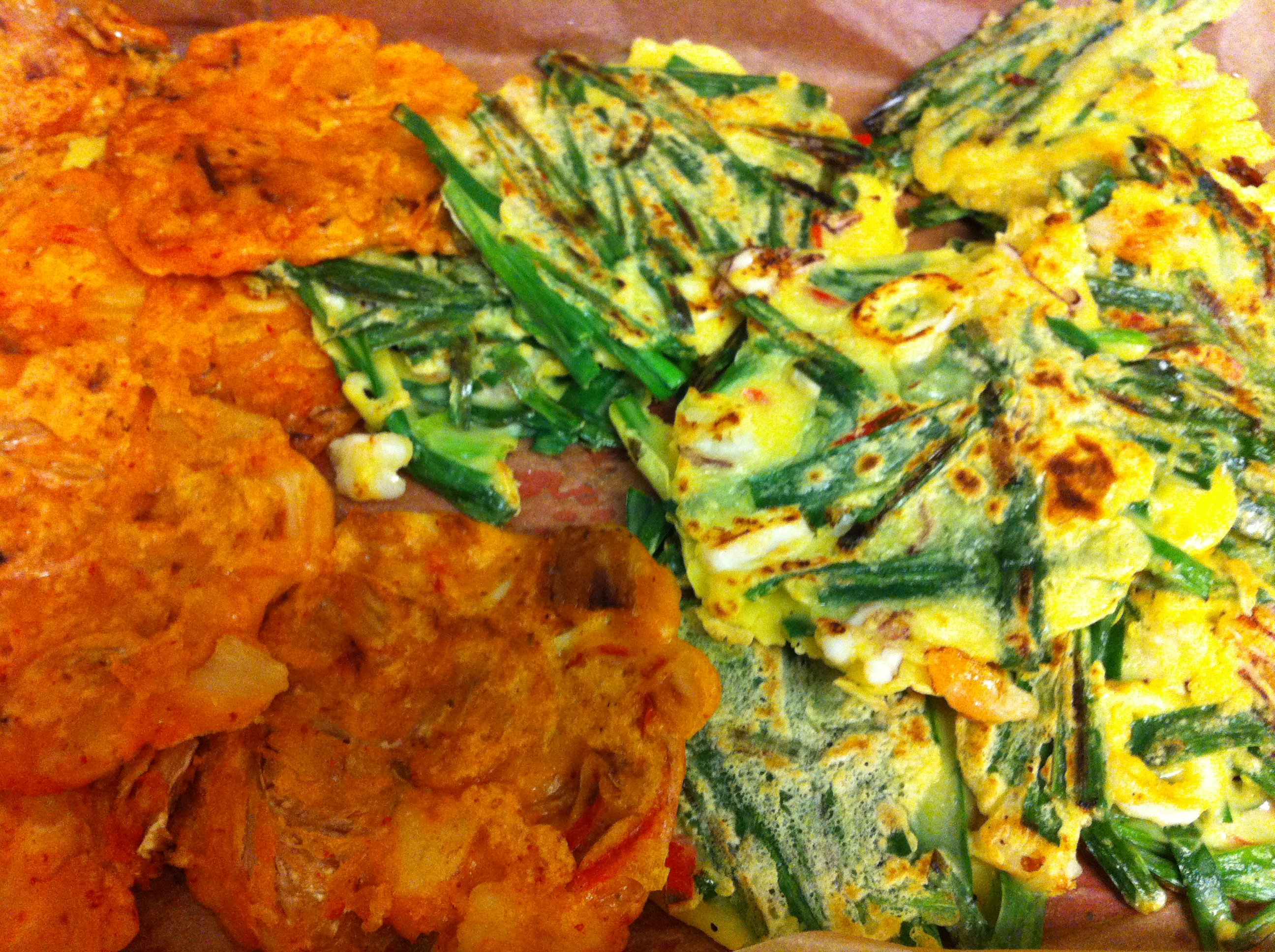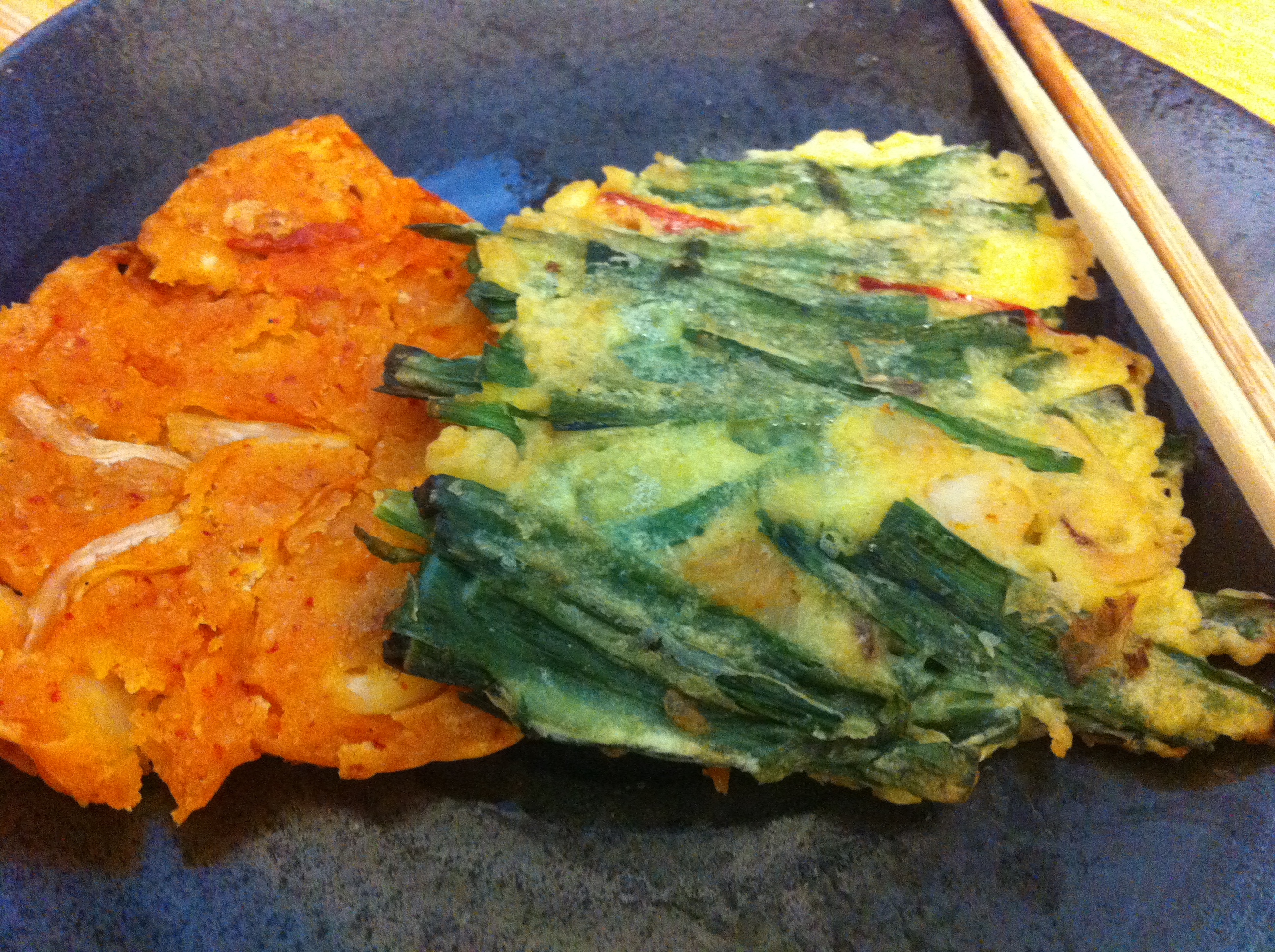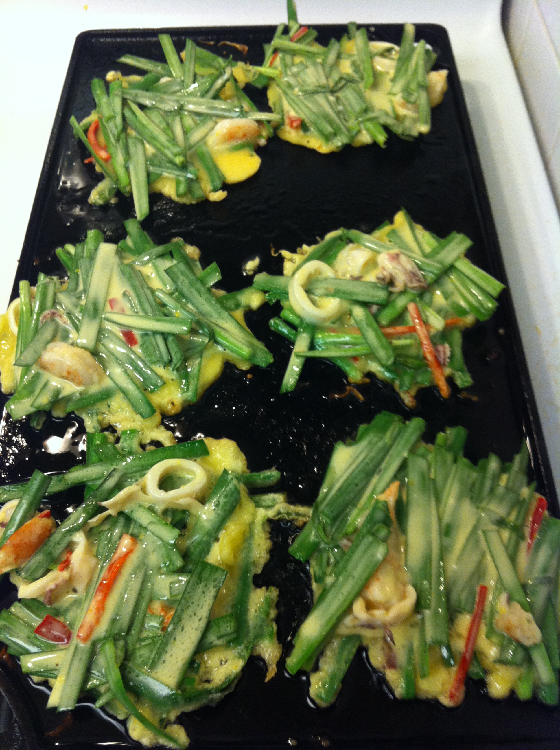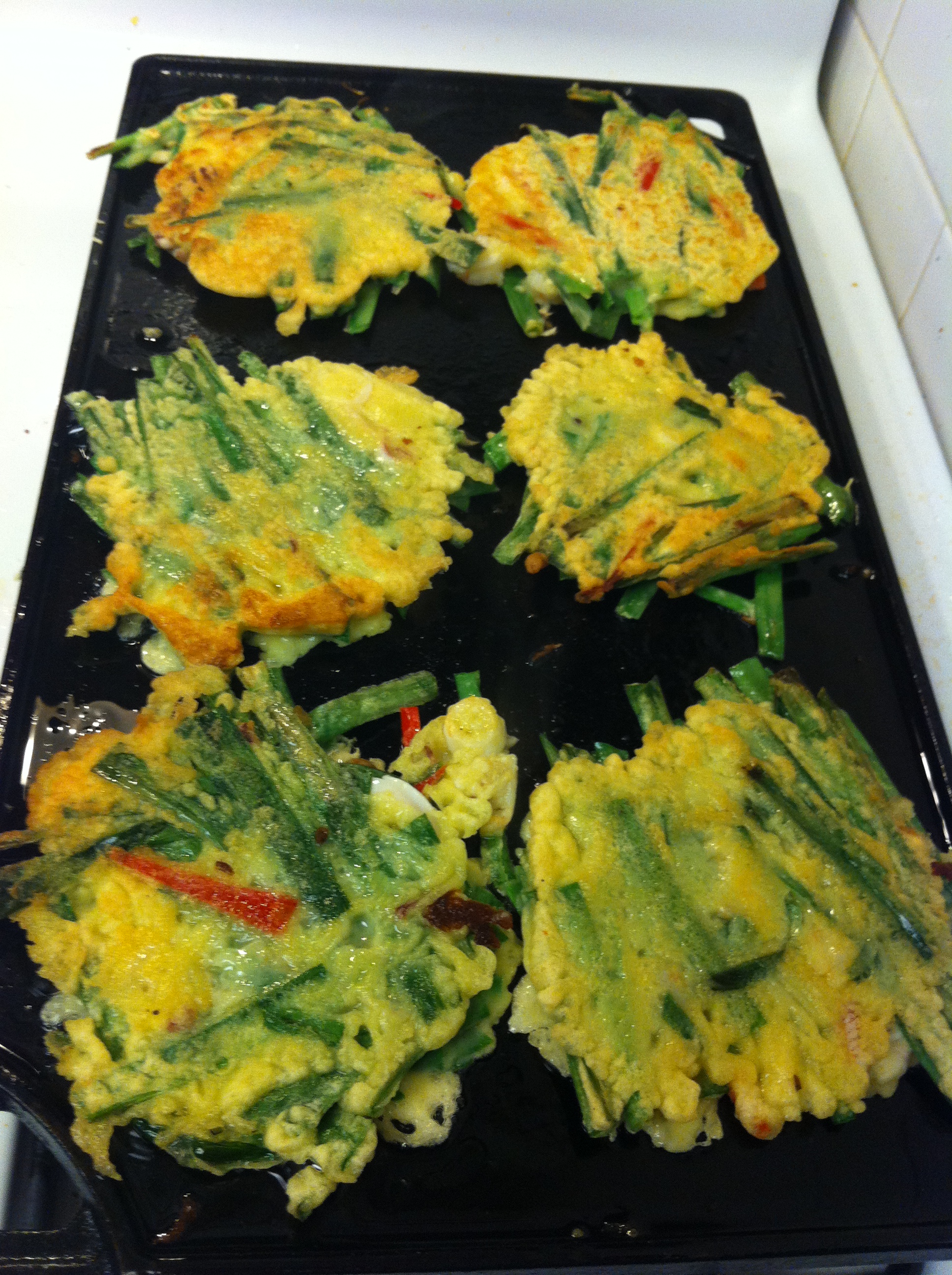 [jeon: Korean pancakes or dish cooked in oil with flour and egg batter, boochu: Korean or Asian chive]