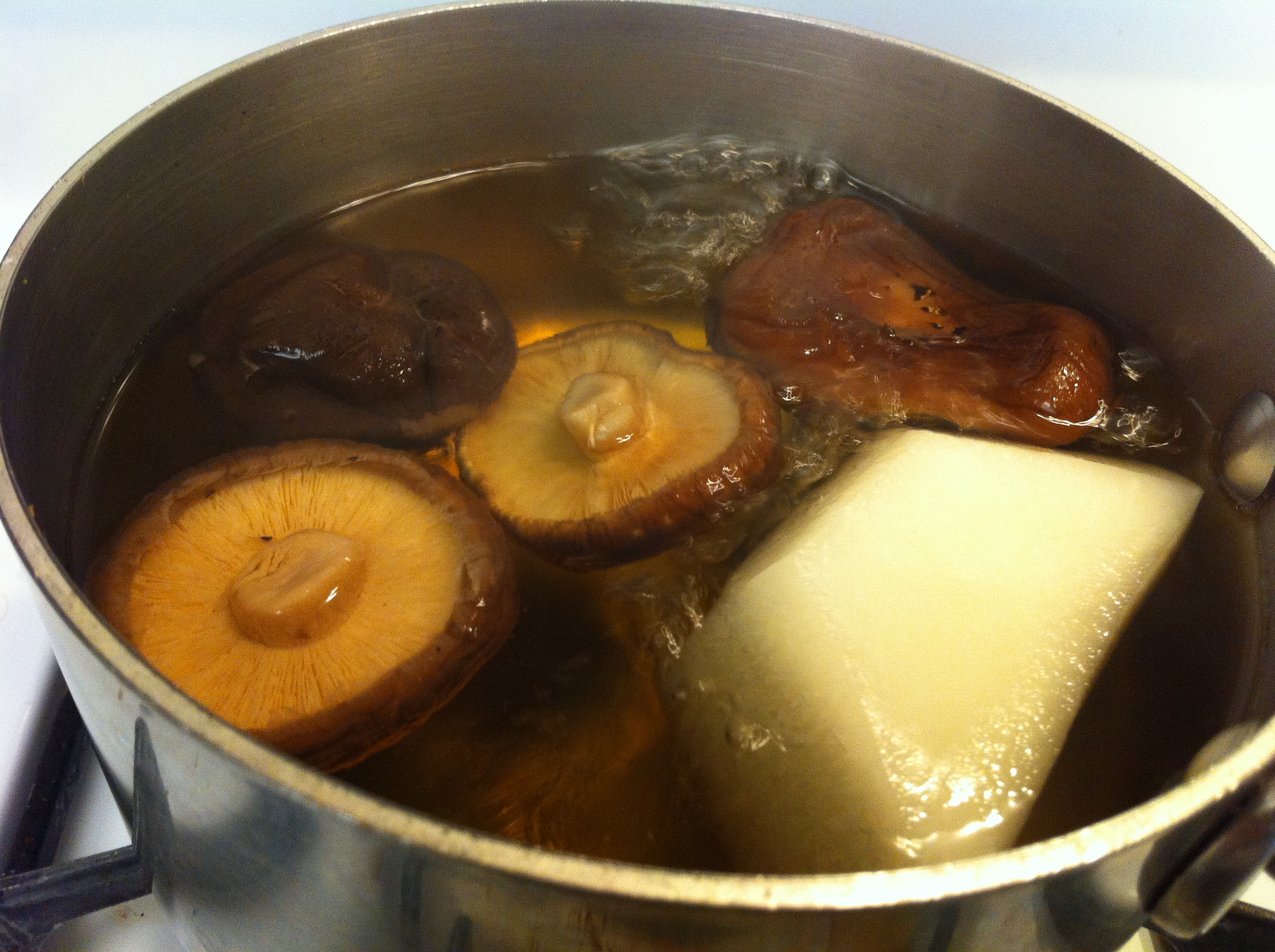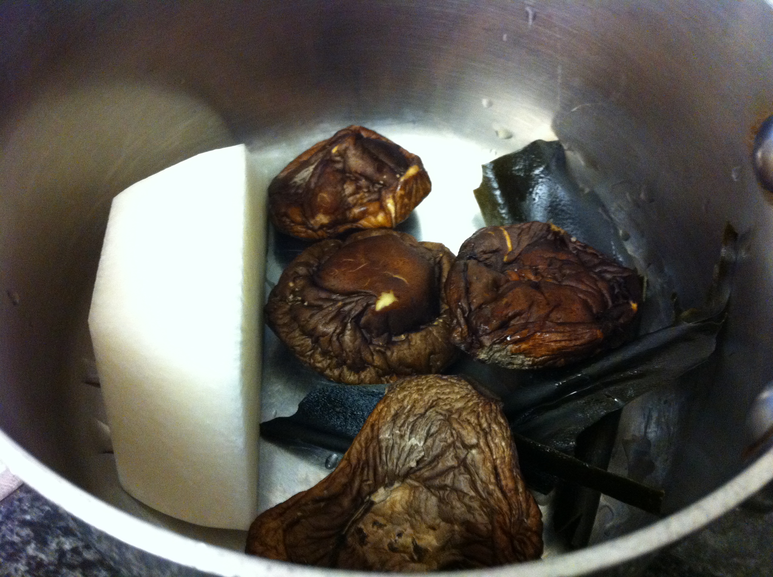 2. Place the mushrooms, dashima and moo in a pot and pour the water in.IMG_3878