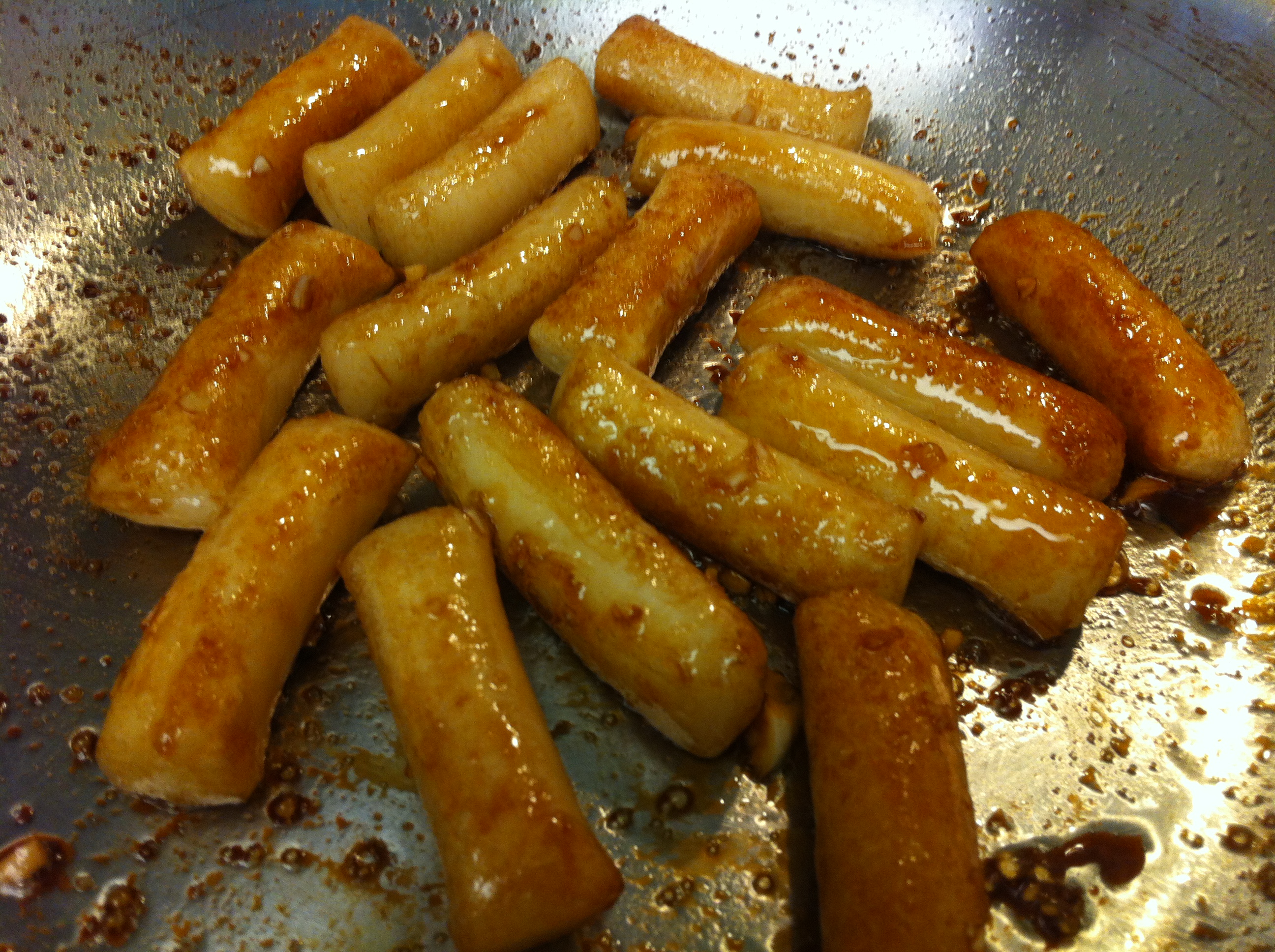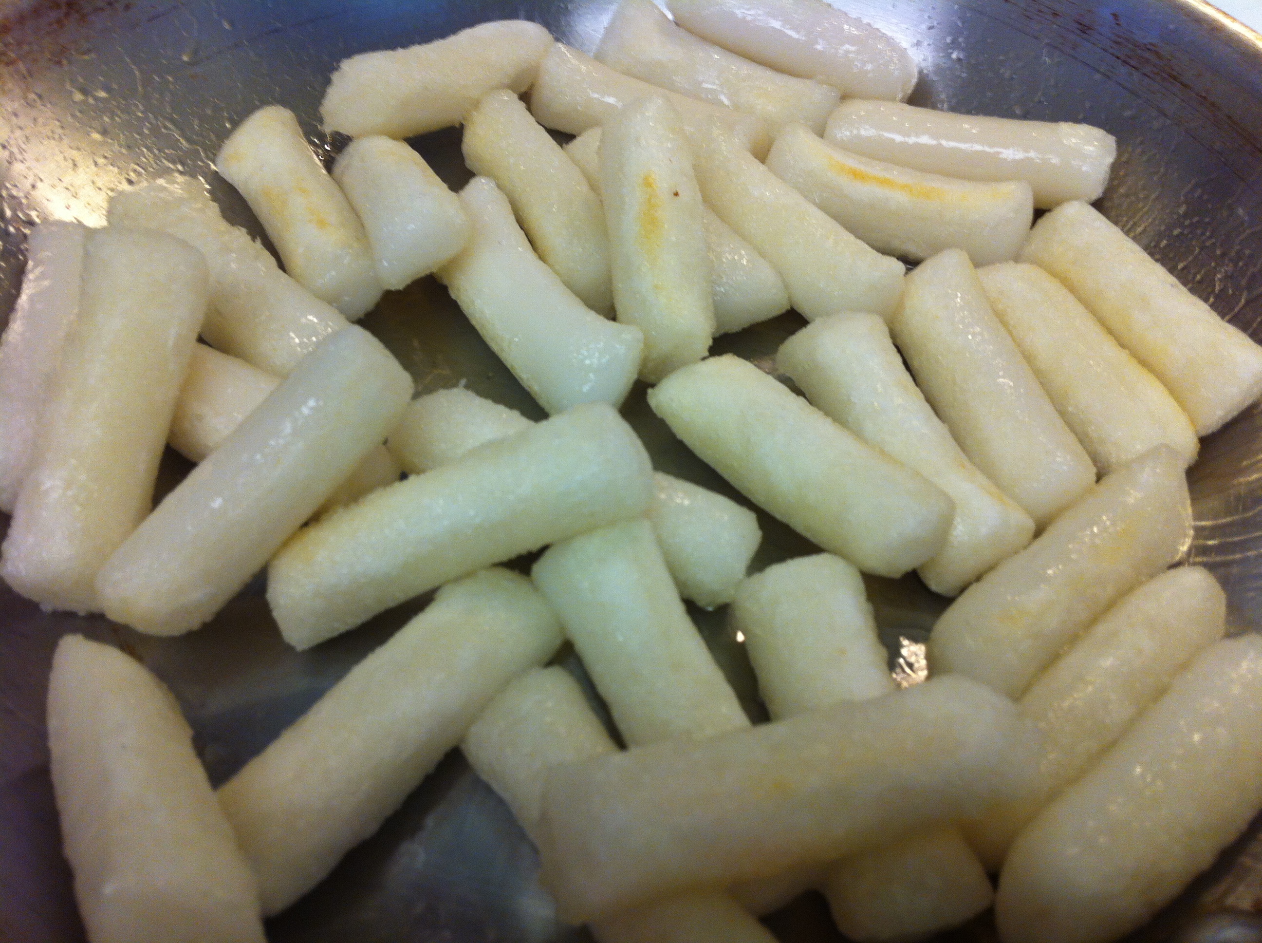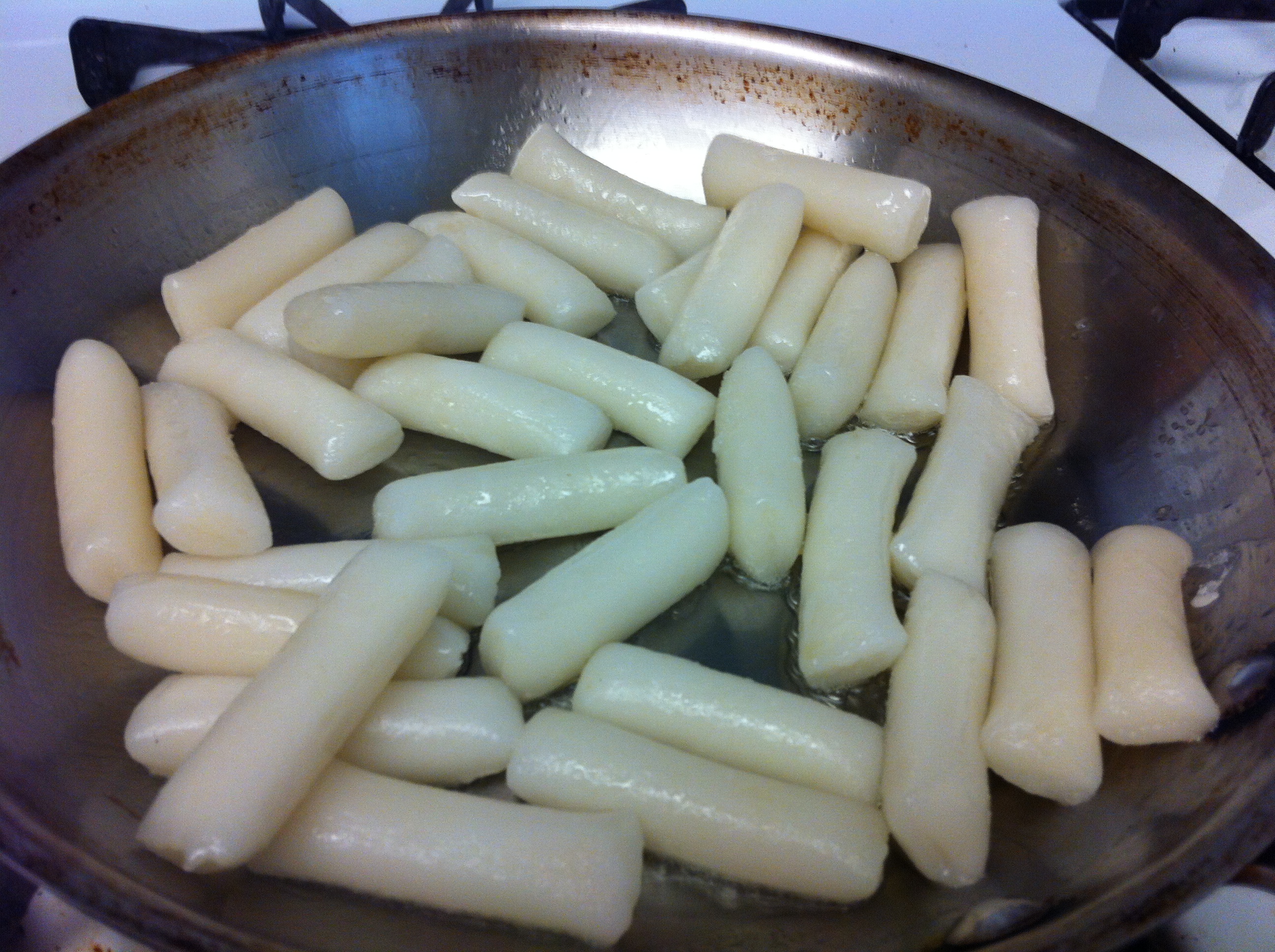 - Drizzle about 5 tablespoons of vegetable oil on a skillet. Fry the ttuck (떡, rice cakes) on high heat for about 5-7 minutes until the surface is crispy.