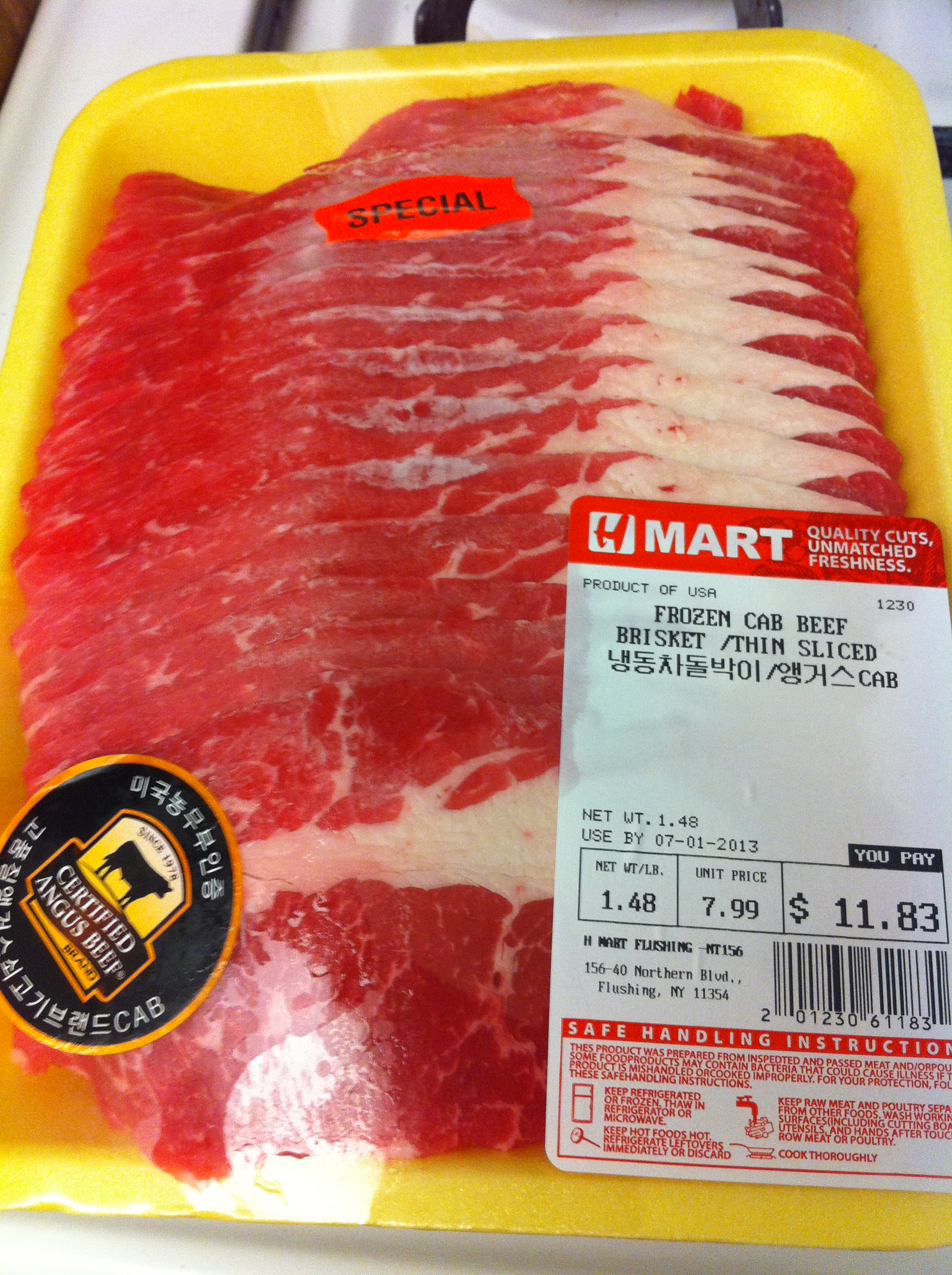 • 100g (about 3-4 ounces) of chadolbagi (차돌박이, thinly sliced brisket)