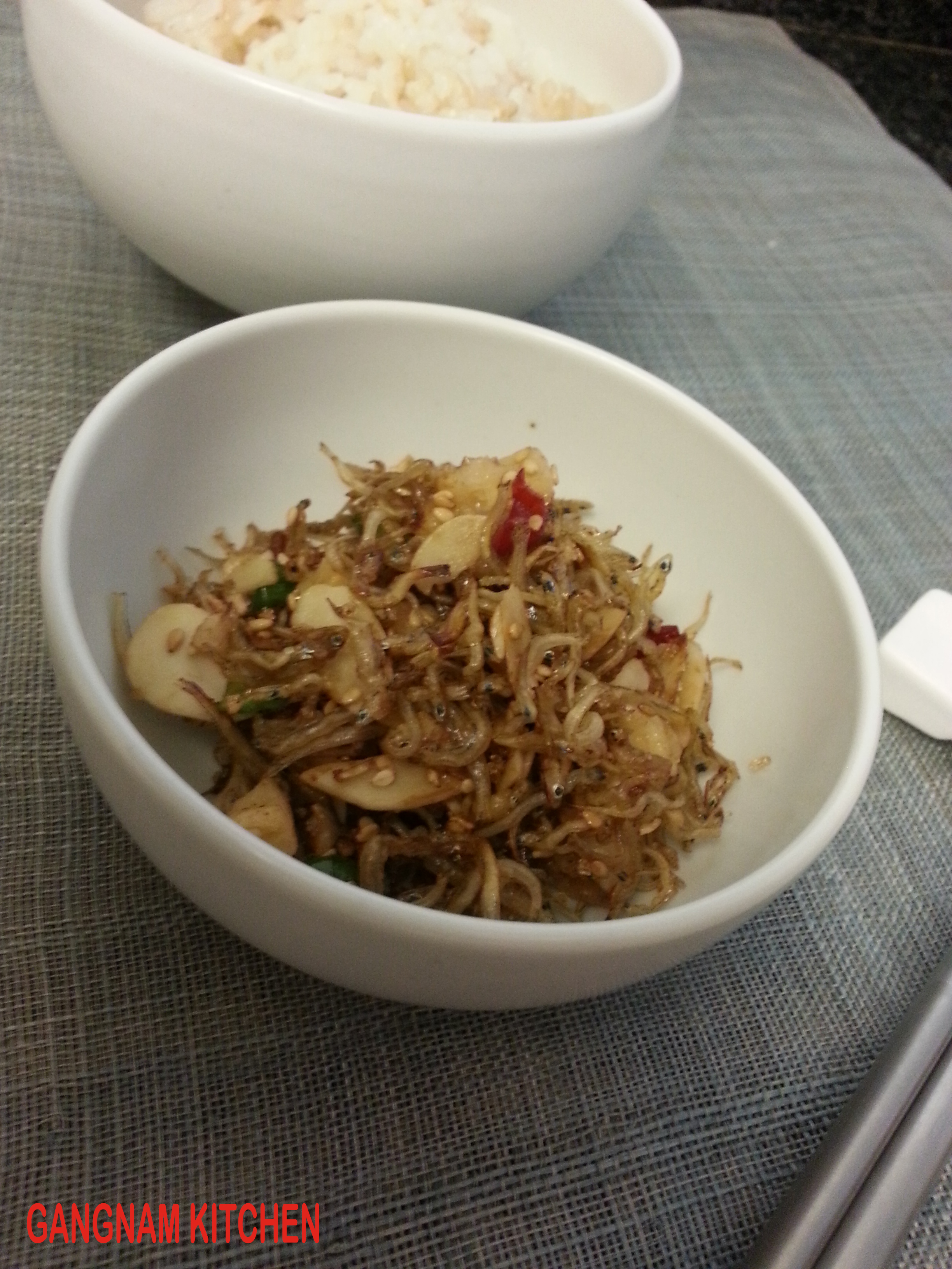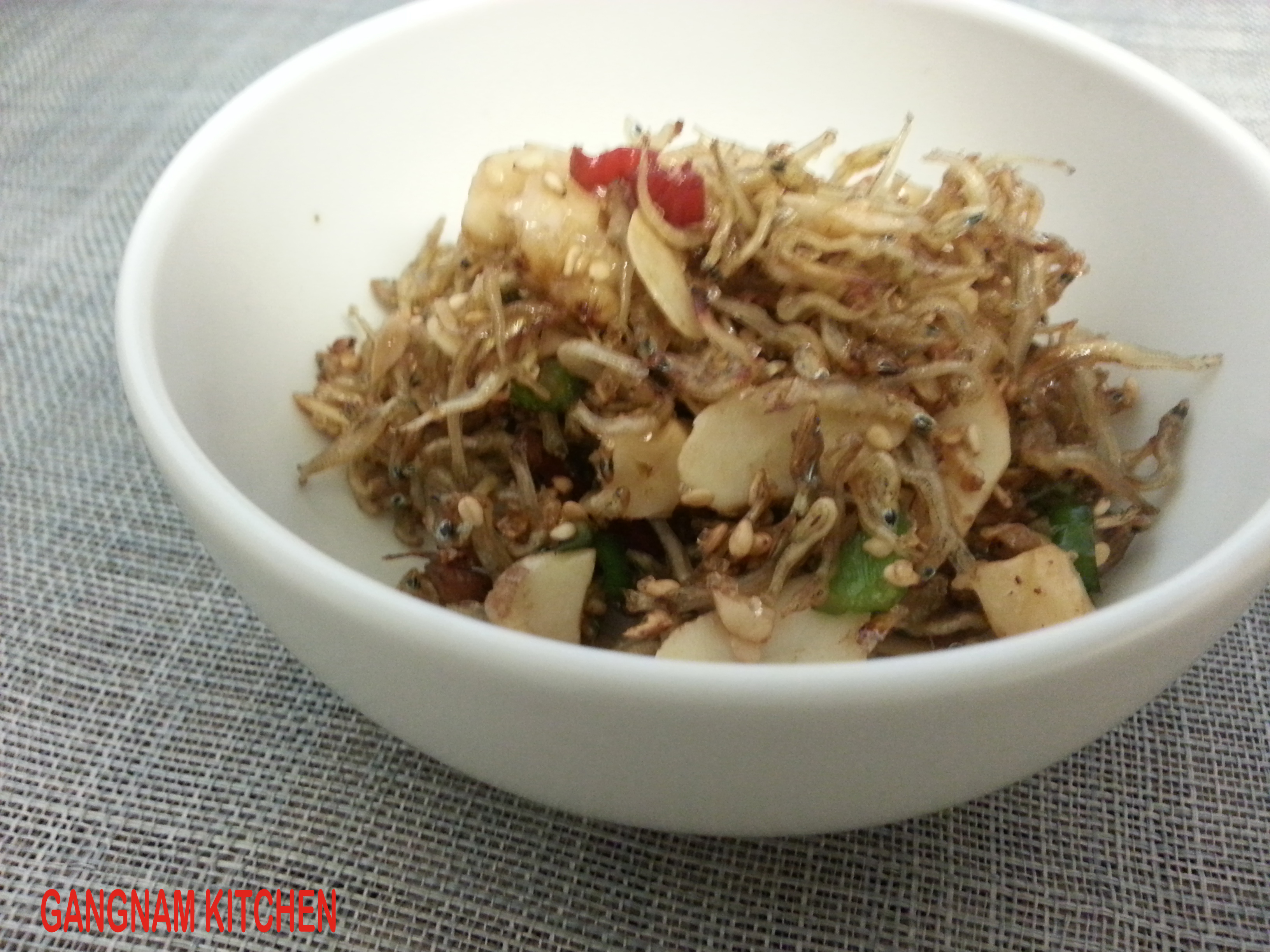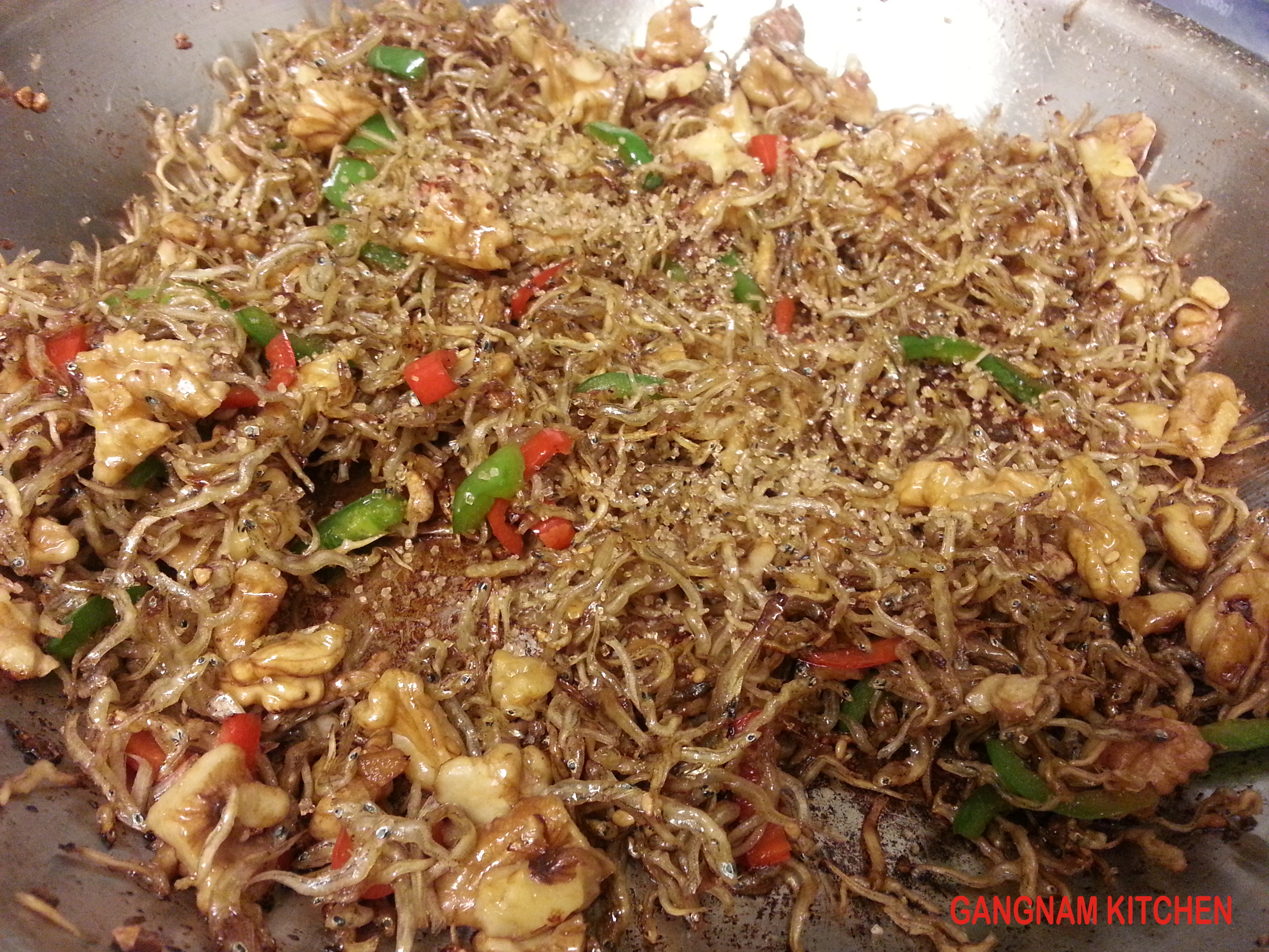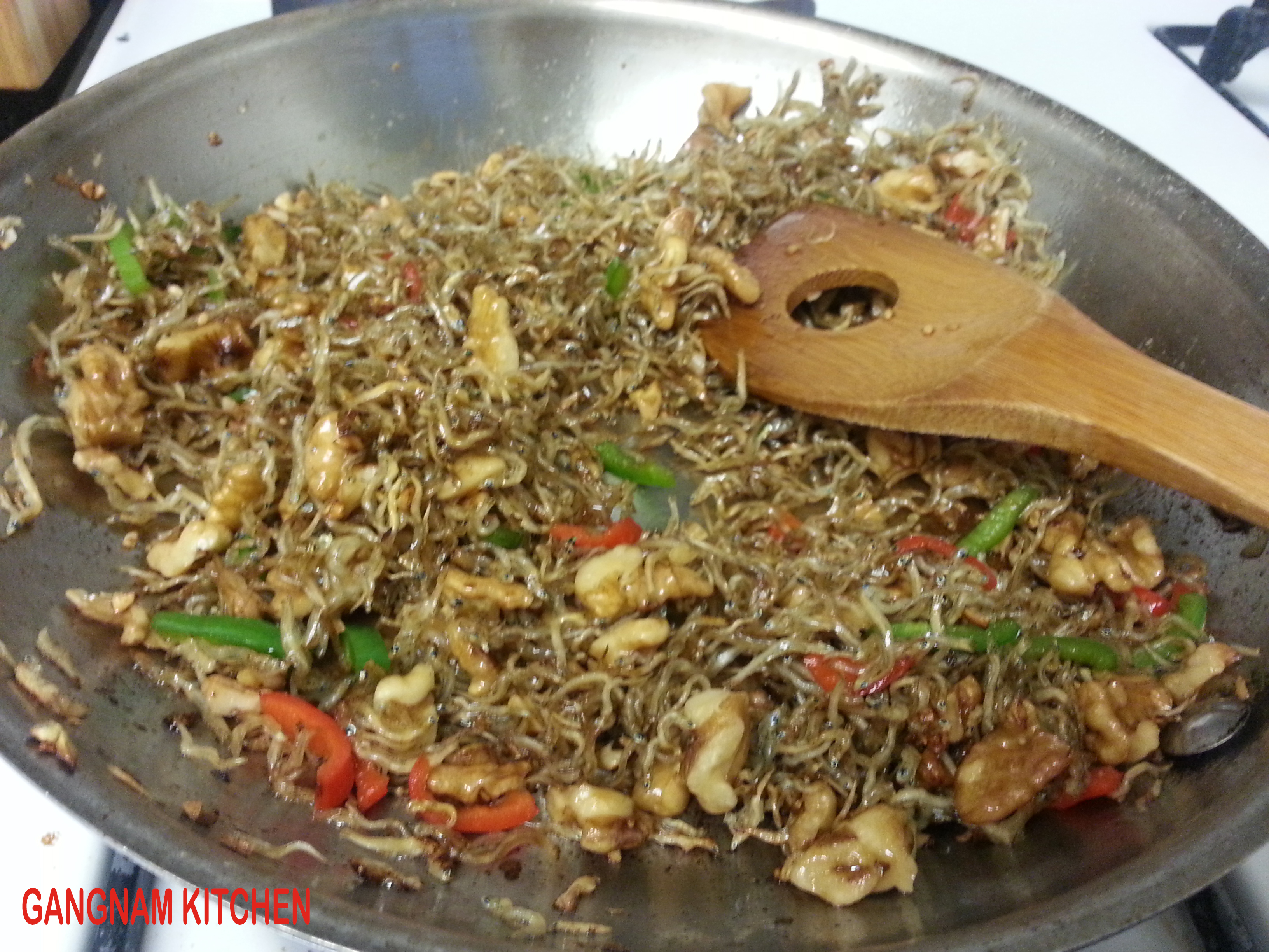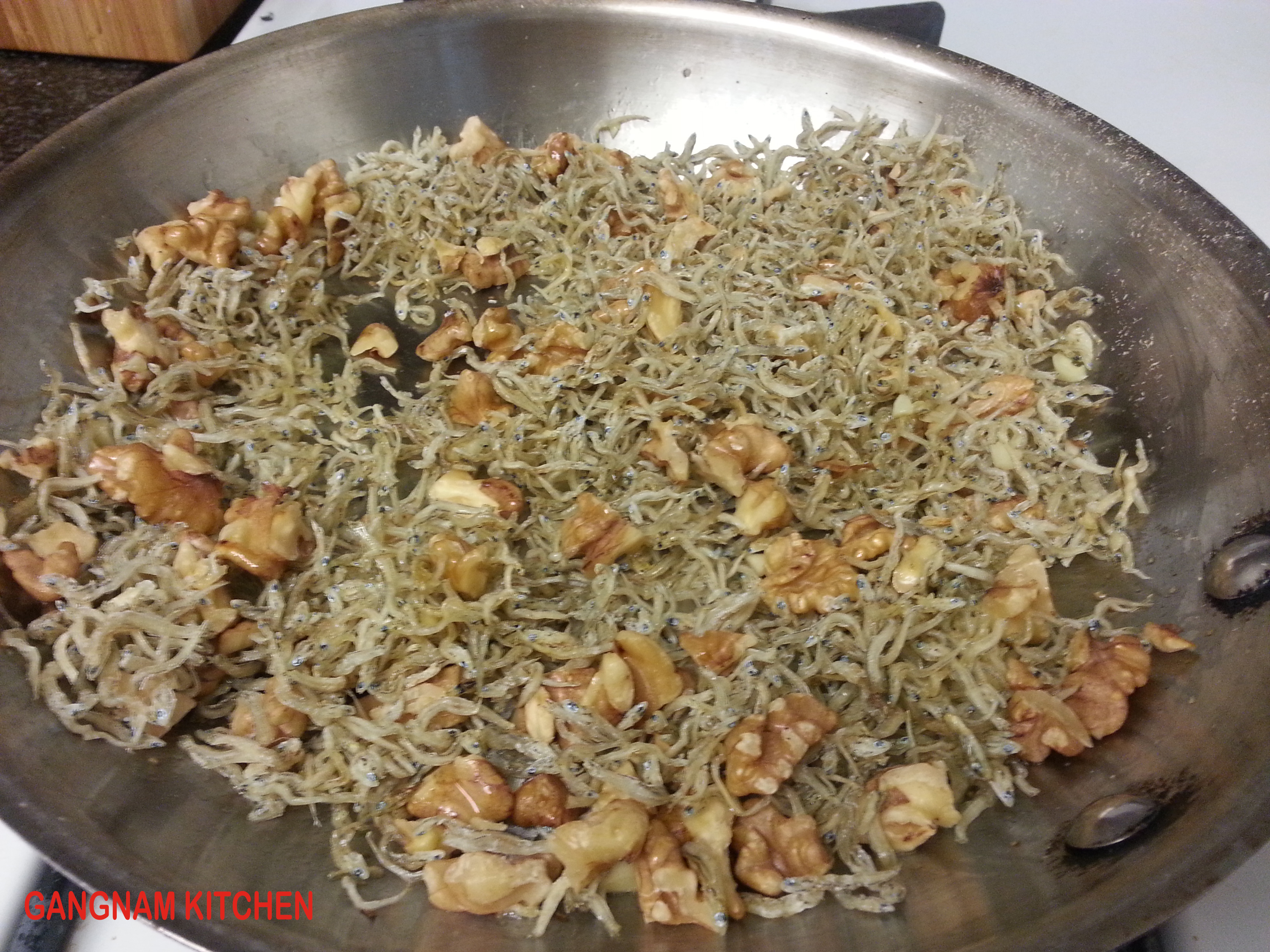First, I want to thank my growing followers despite my long absence. It’s been a while since I’ve posted a recipe; I’ve been traveling a lot, to Seoul, L.A., Honolulu/Maui and Cleveland (my husband’s hometown). Today, I decided to start with one of my favorite banchans (반찬, side dishes), myulchi-bokkeum (멸치볶음). Myulchi (멸치) are dried anchovies that come in various sizes and used in many different ways, usually the large ones for myulchi broth and the small ones cooked as banchans (side dish). Myulchi are a nutritious food, high is calcium and protein as well as omega-3, DHA and EPA, especially great for children because it helps growth, brain development and memory. I added nuts to add even more nutrition but adding nuts also cuts the salt. You can add any nuts you may have at home, such as almonds, walnuts, pine nuts or peanuts. I especially like this dish because it is not only healthy, but it is easy and quick to make. It takes me only about 15-20 minutes and lasts a very long time in the refrigerator.