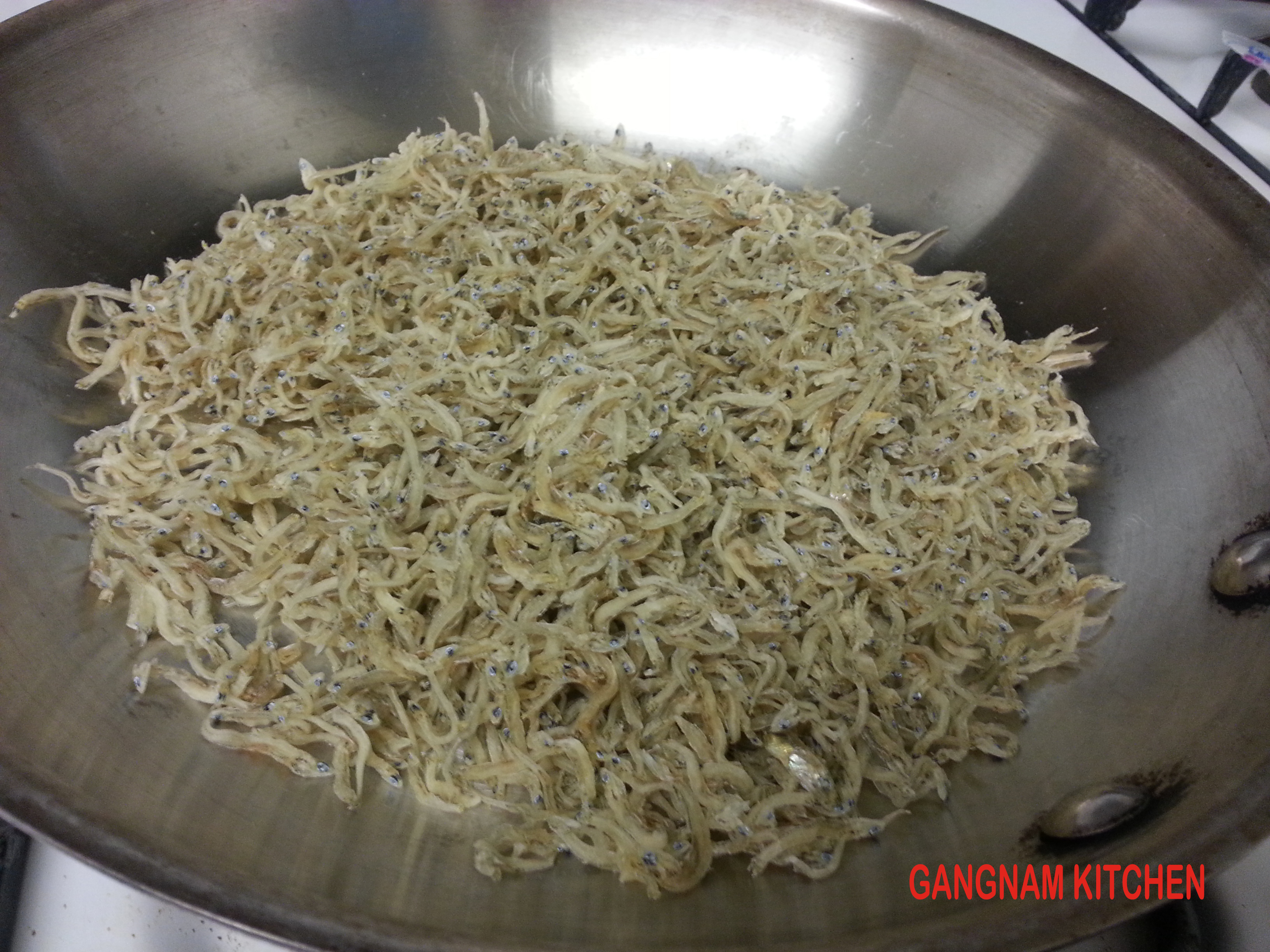 - Add the myulchi (멸치, dried anchovies) in a dry pan and sauté on medium-low heat for about 5 minutes. This vaporizes any moisture, gives it a crunch and removes any unpleasant odor.