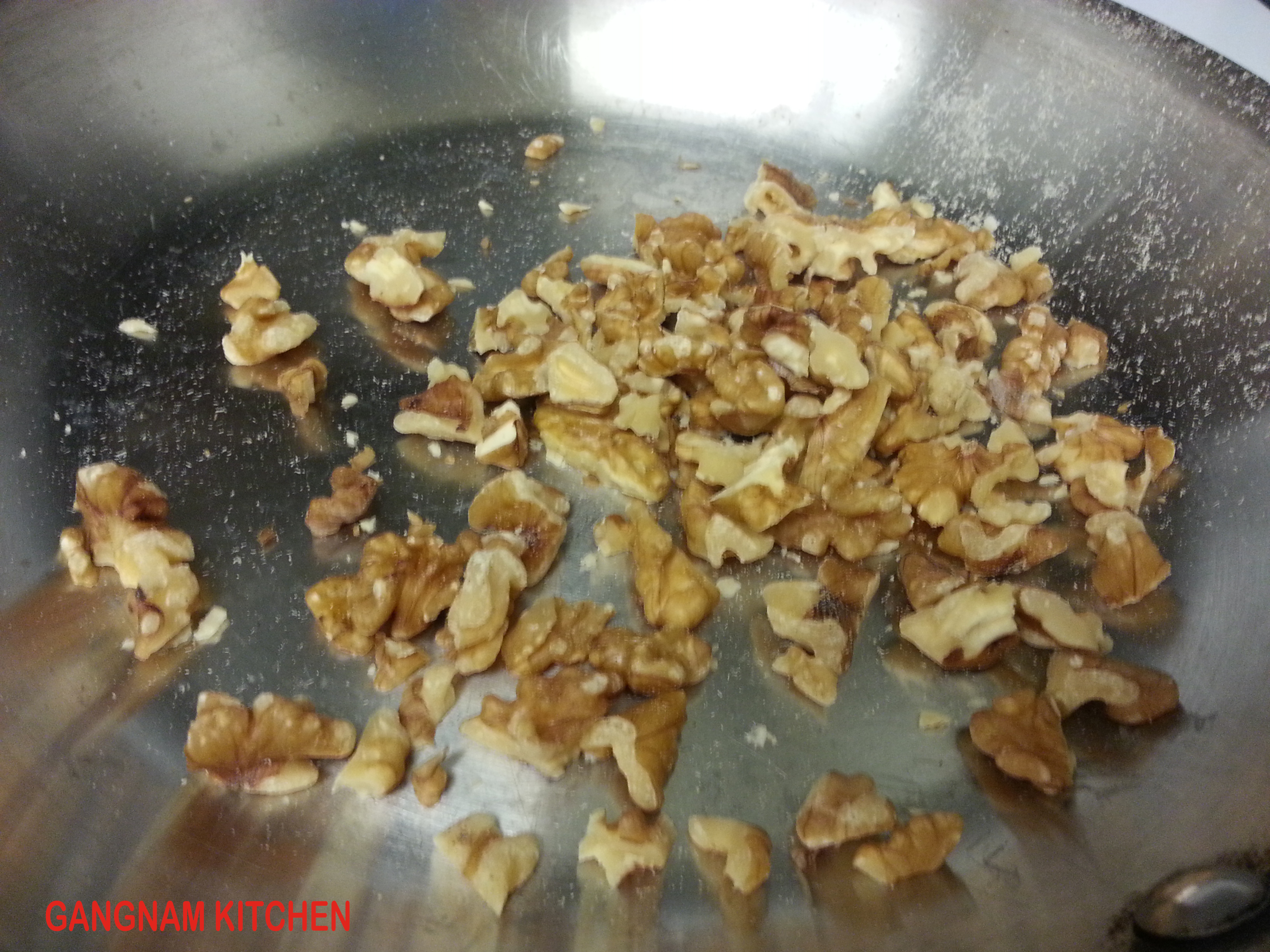 - Add the nuts in the same pan and lightly roast them for about 3 minutes. Move the nuts to the same plate as the myulchi.
