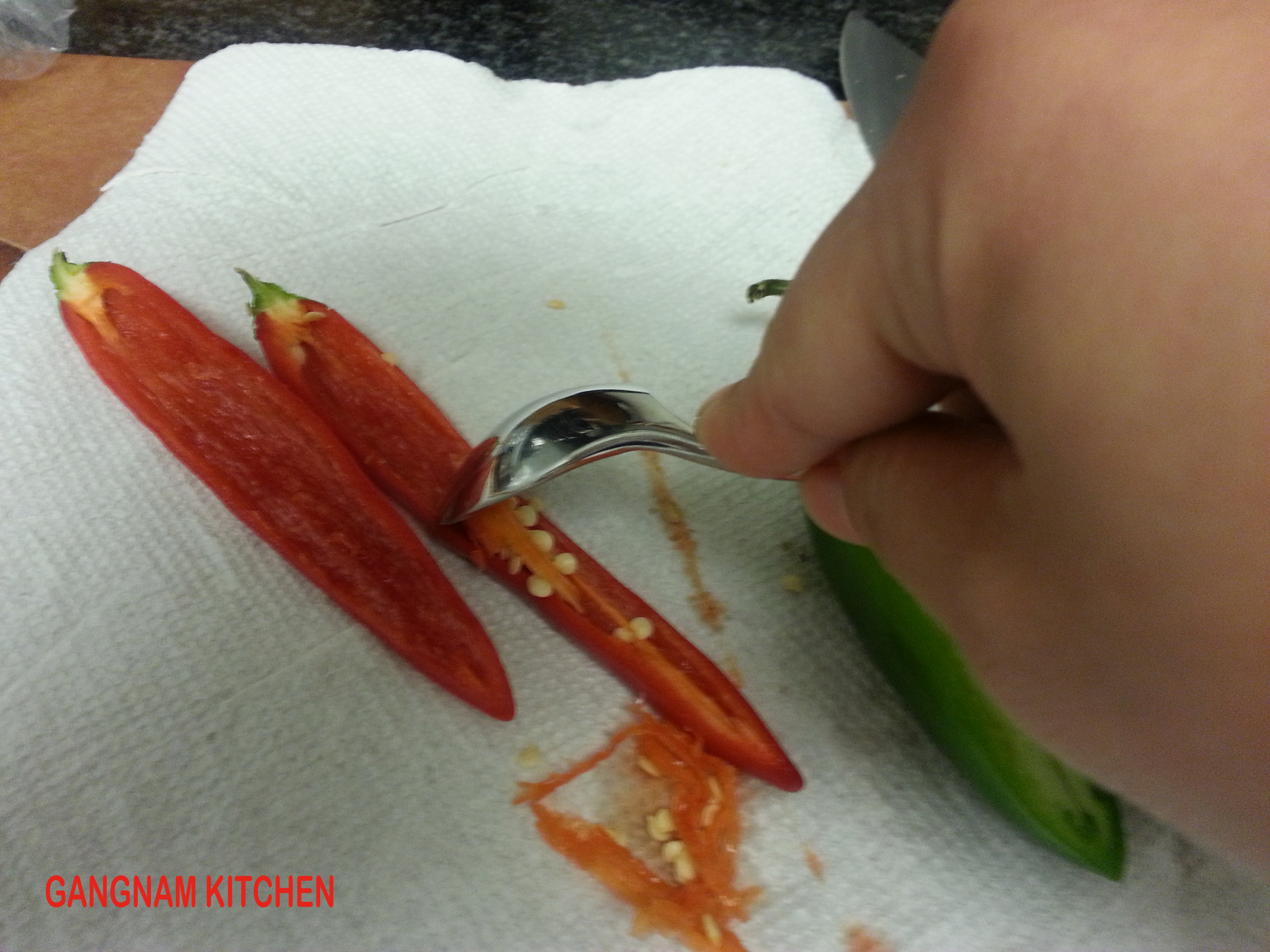 - Slice the chilies length wise then scrape out the seeds with a small spoon. Cut into small pieces.