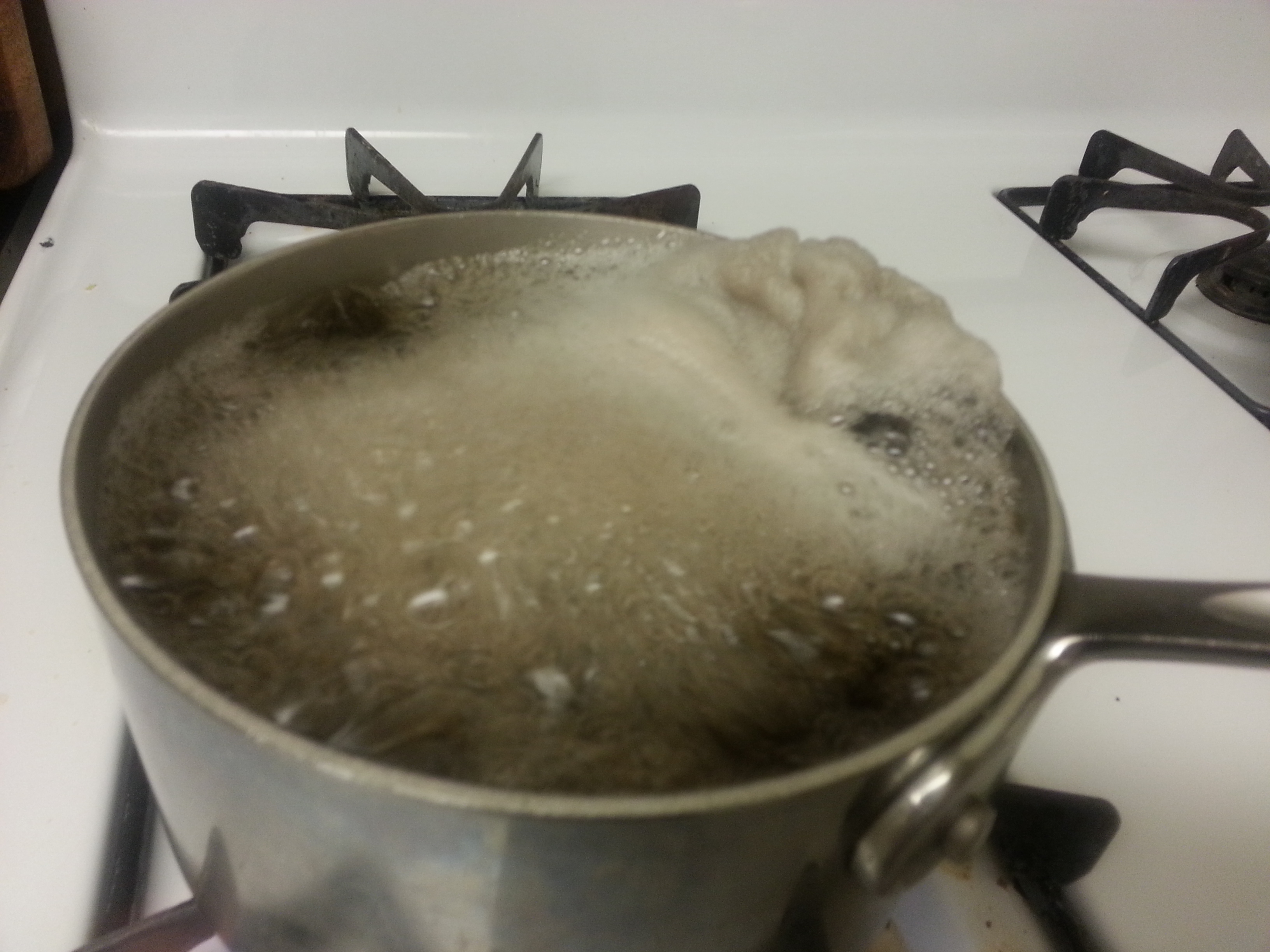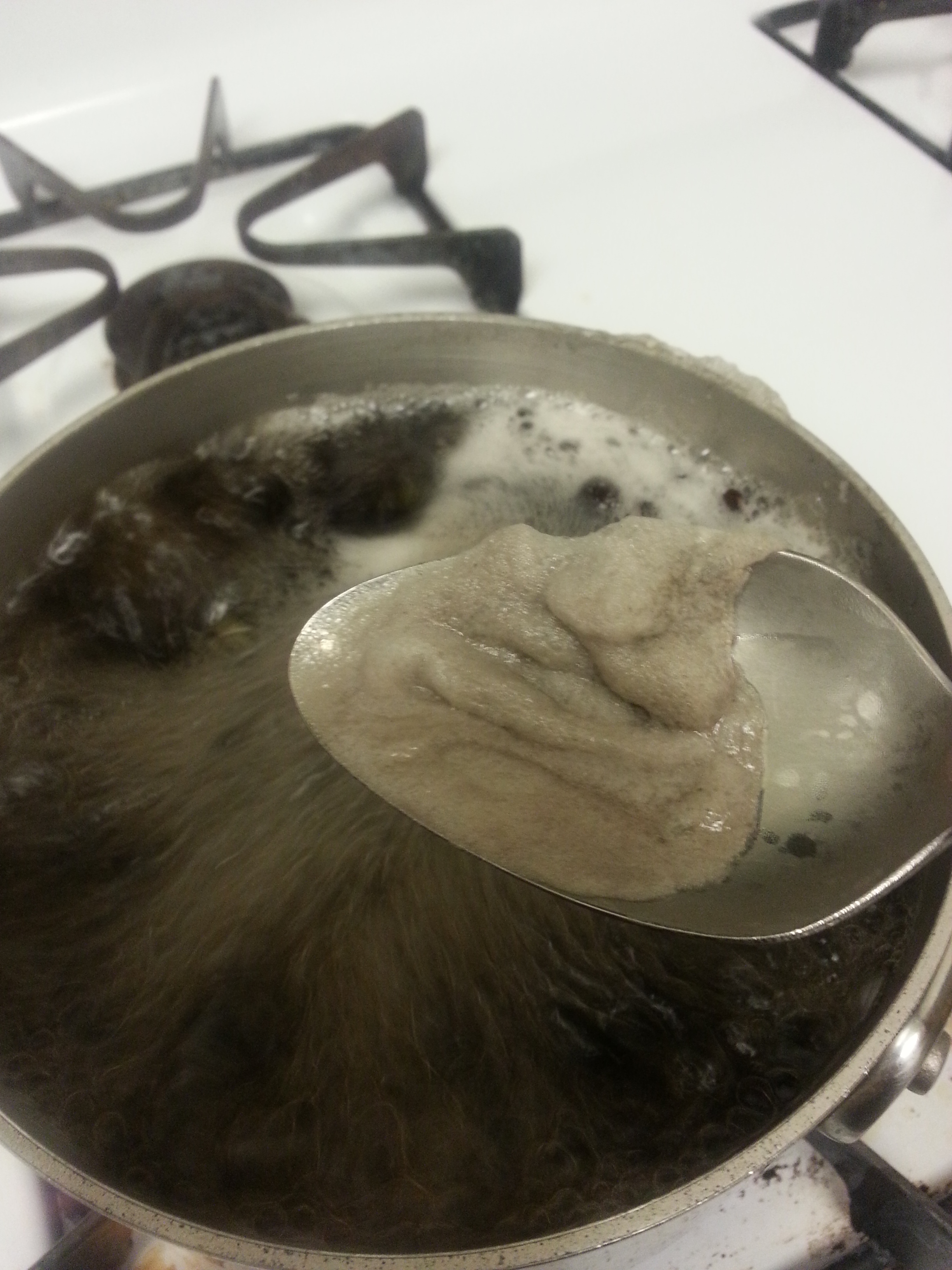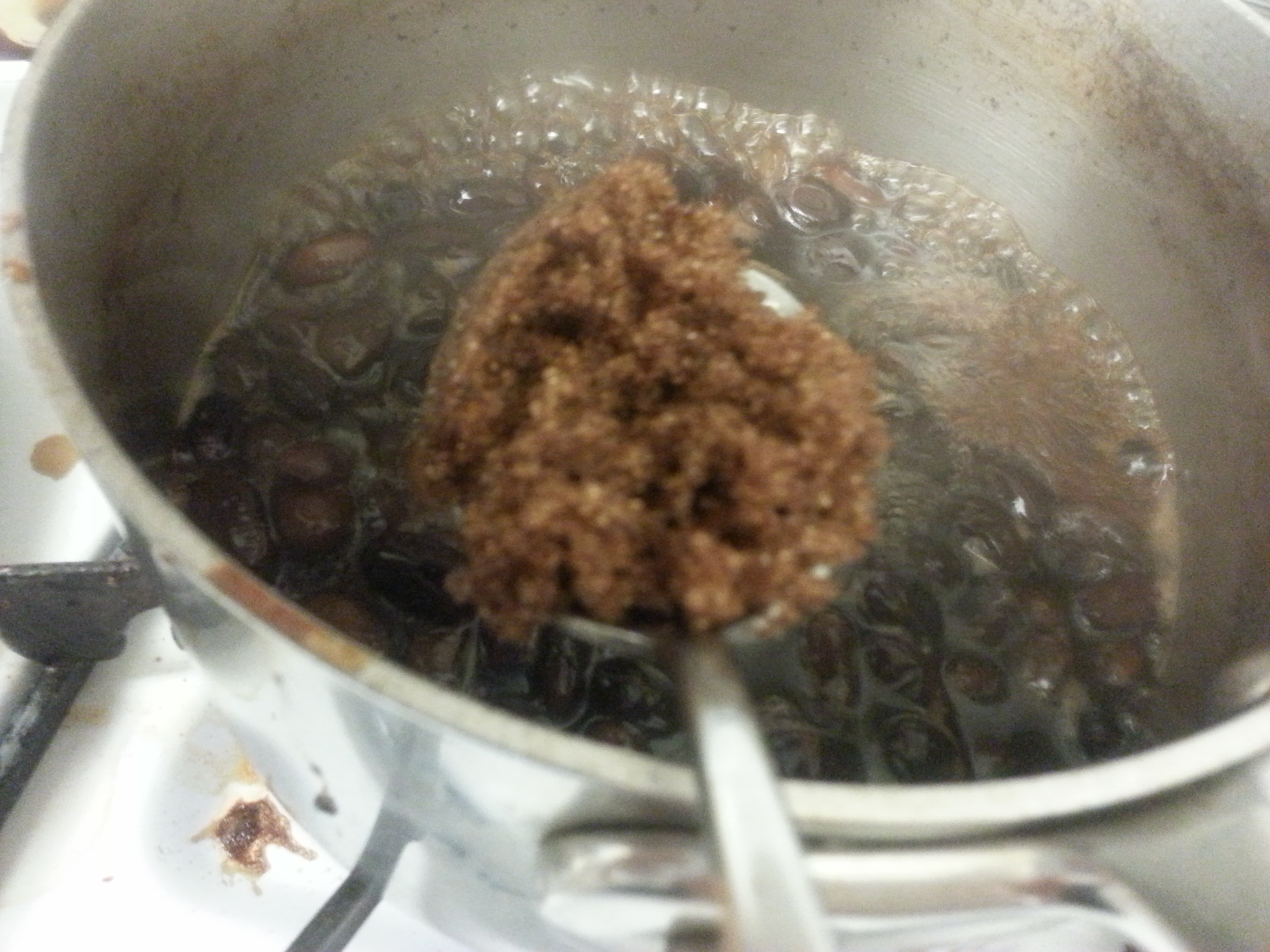 6. Add the rest of the ingredients EXCEPT for the sugar. Mirin or sake added is to cut out any “bean” smell. Keep an eye on the pot and stir often so it doesn’t burn at the bottom.